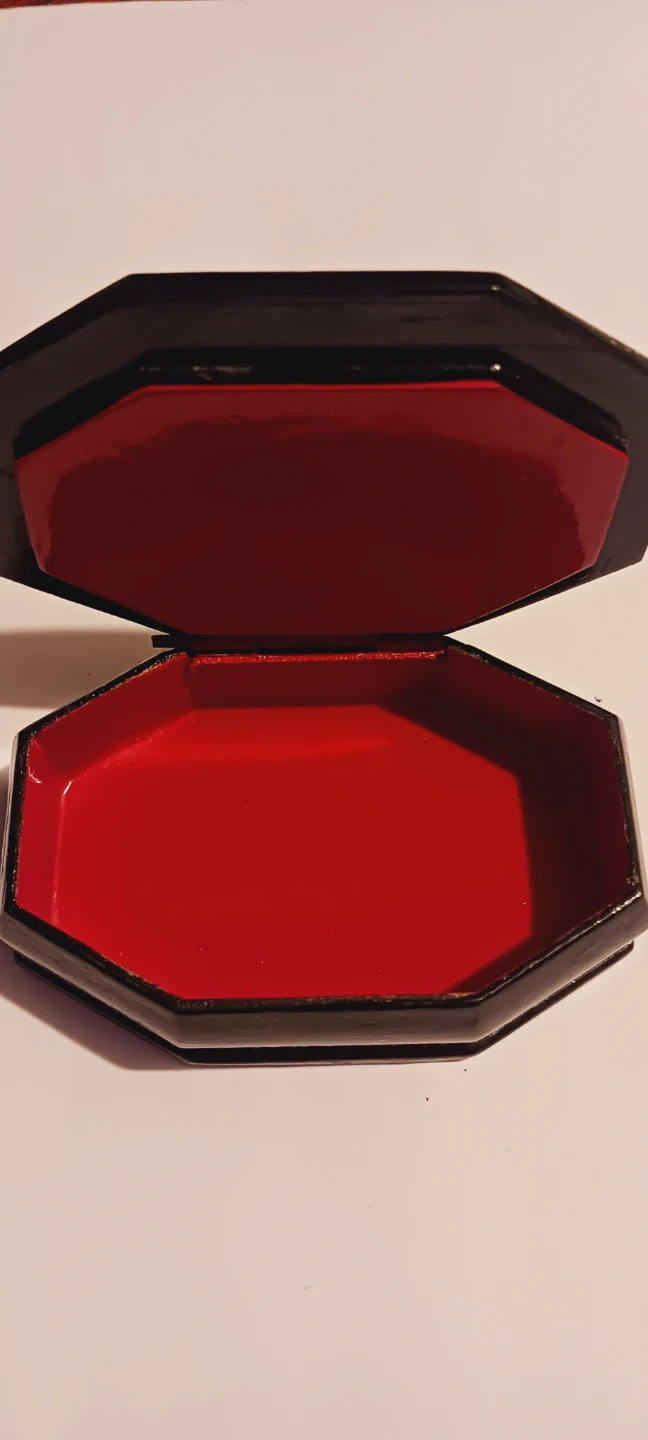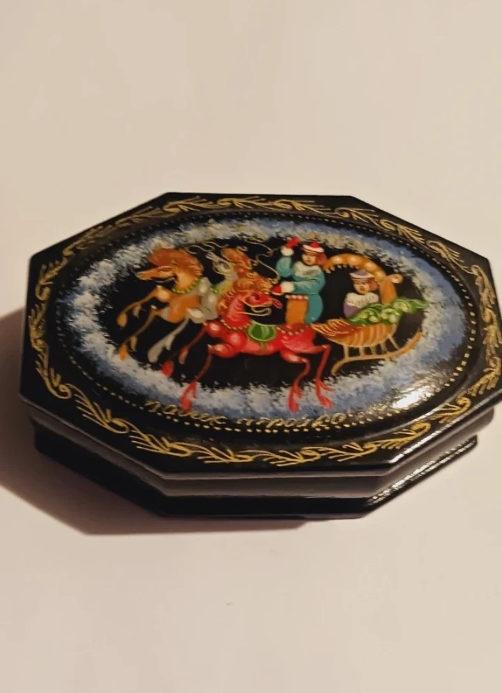 Russian Handpainted Decorative Lacquered Miniature Trinket Box with a hand-painted winter sleigh scene. Features a black exterior with gold trim and a red interior lining. It's octagonal in shape. 3"×2"×1". Excellent condition. ALL MY PRICES ARE NEGOTIABLE !!