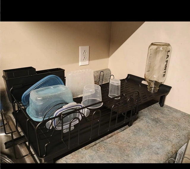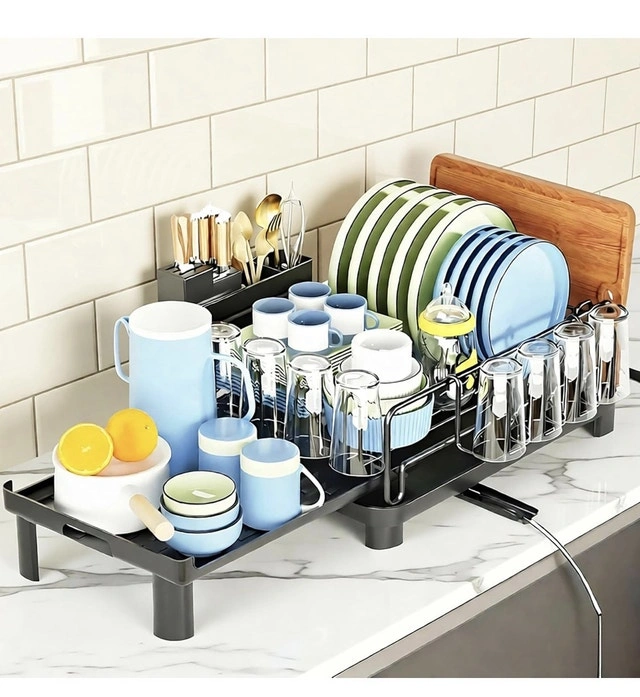 Keep your kitchen tidy with this brand new, large dish drying rack, perfect for any modern home. This spacious rack is designed to efficiently dry a large number of dishes, utensils, and cookware all at once. Its sturdy construction ensures stability and durability, making it a reliable addition to your kitchen. Features: Large capacity for drying multiple items, Durable and stable construction, Removable utensil holder, Extendable design. If you're seeing this ad, the dish drying rack is still available!