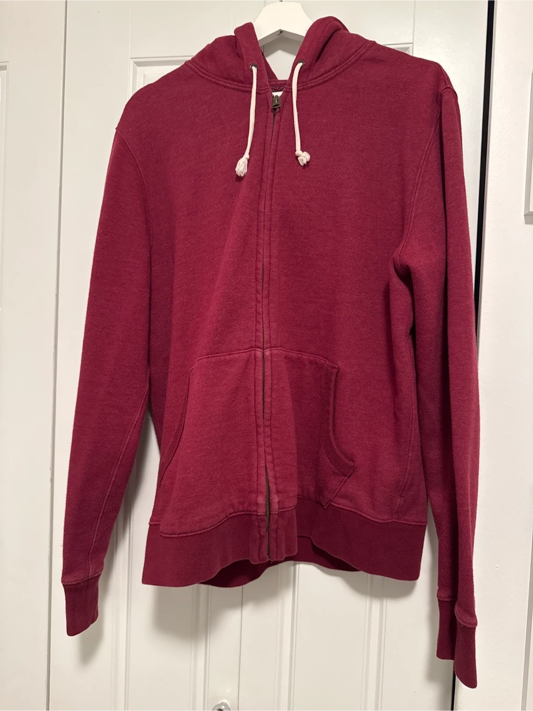 This is a men's red full zip hoodie. It's made from a soft cotton blend. It has a kangaroo pocket and an adjustable drawstring hood. Great for casual wear!