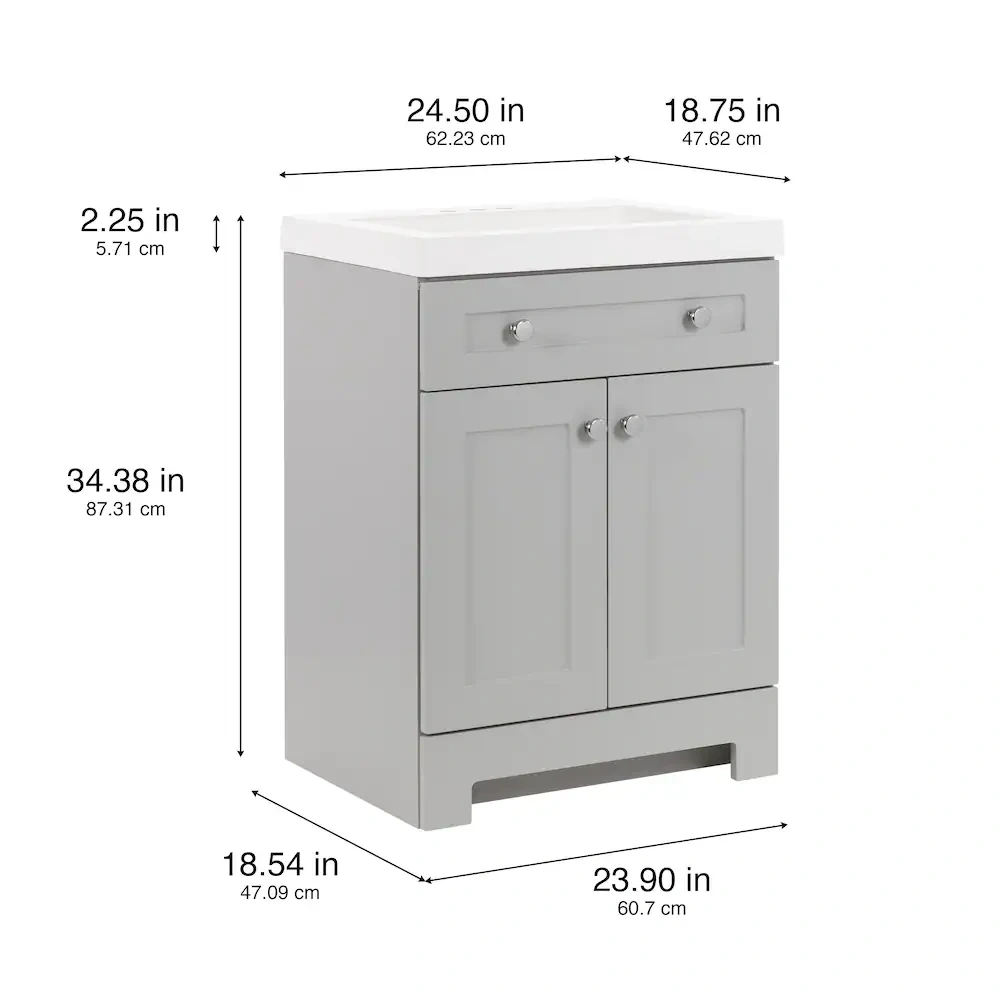 This vanity features a light grey finish and two cabinet doors, plus a top drawer. It comes with a white integrated sink. Cabinetry provides storage space.