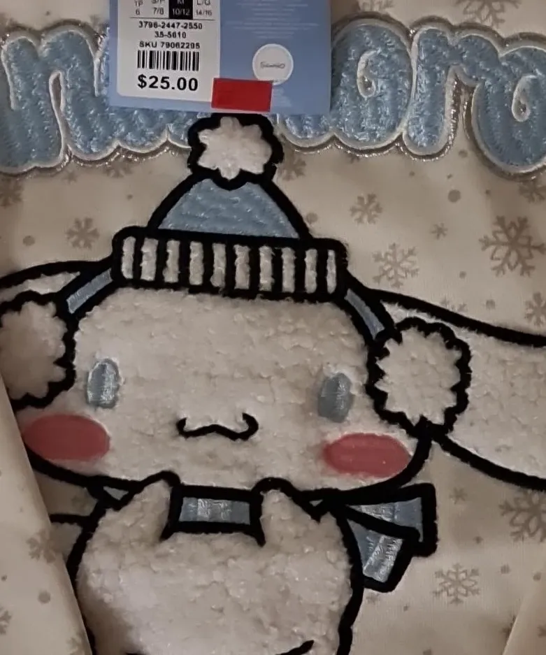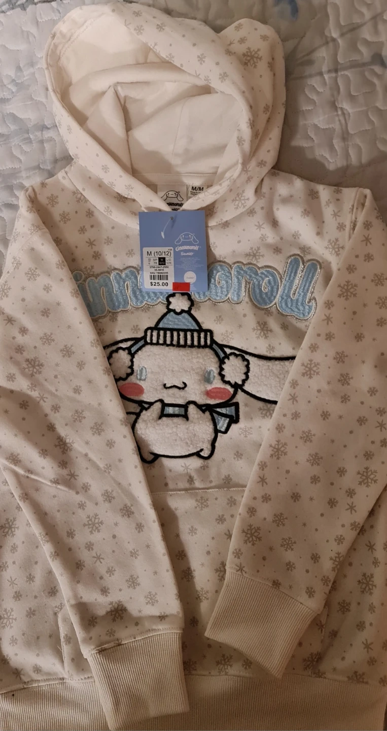 This is a NEW cozy Sanrio Cinnamoroll hoodie. It's a size M, which fits 10/12. The hoodie features a cute Cinnamoroll graphic with a wintery snowflake pattern all over. It's made from a soft material, perfect for cooler weather!