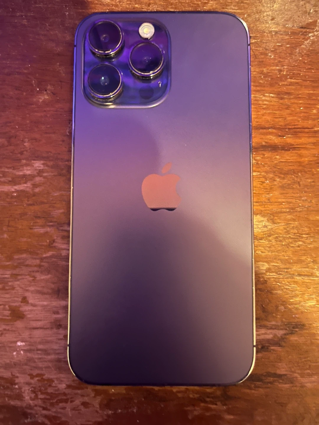 This is an Apple iPhone 14 Pro Max in a deep purple colour. It's a modern smartphone with a powerful camera system. This device is great for capturing high-quality photos and videos!