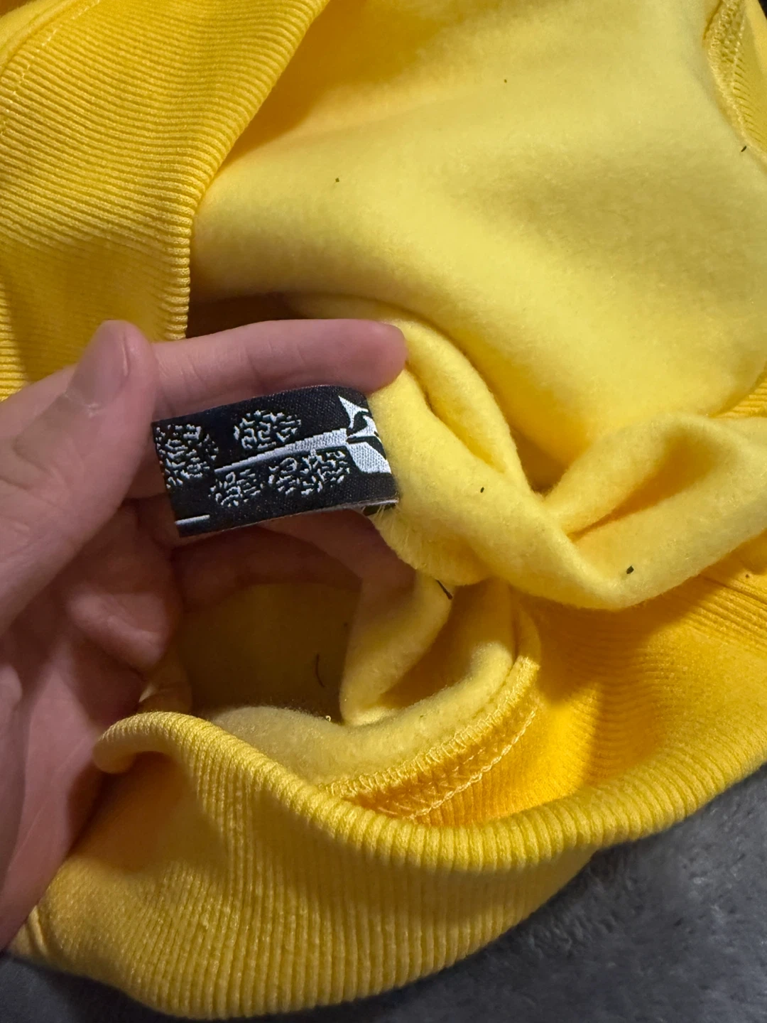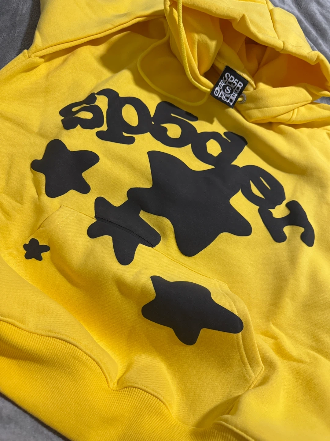 Bright yellow hoodie featuring the Sp5der logo and black star graphic. It's made from a comfortable fabric blend. This pullover style hoodie has a front pouch pocket and a drawstring hood.