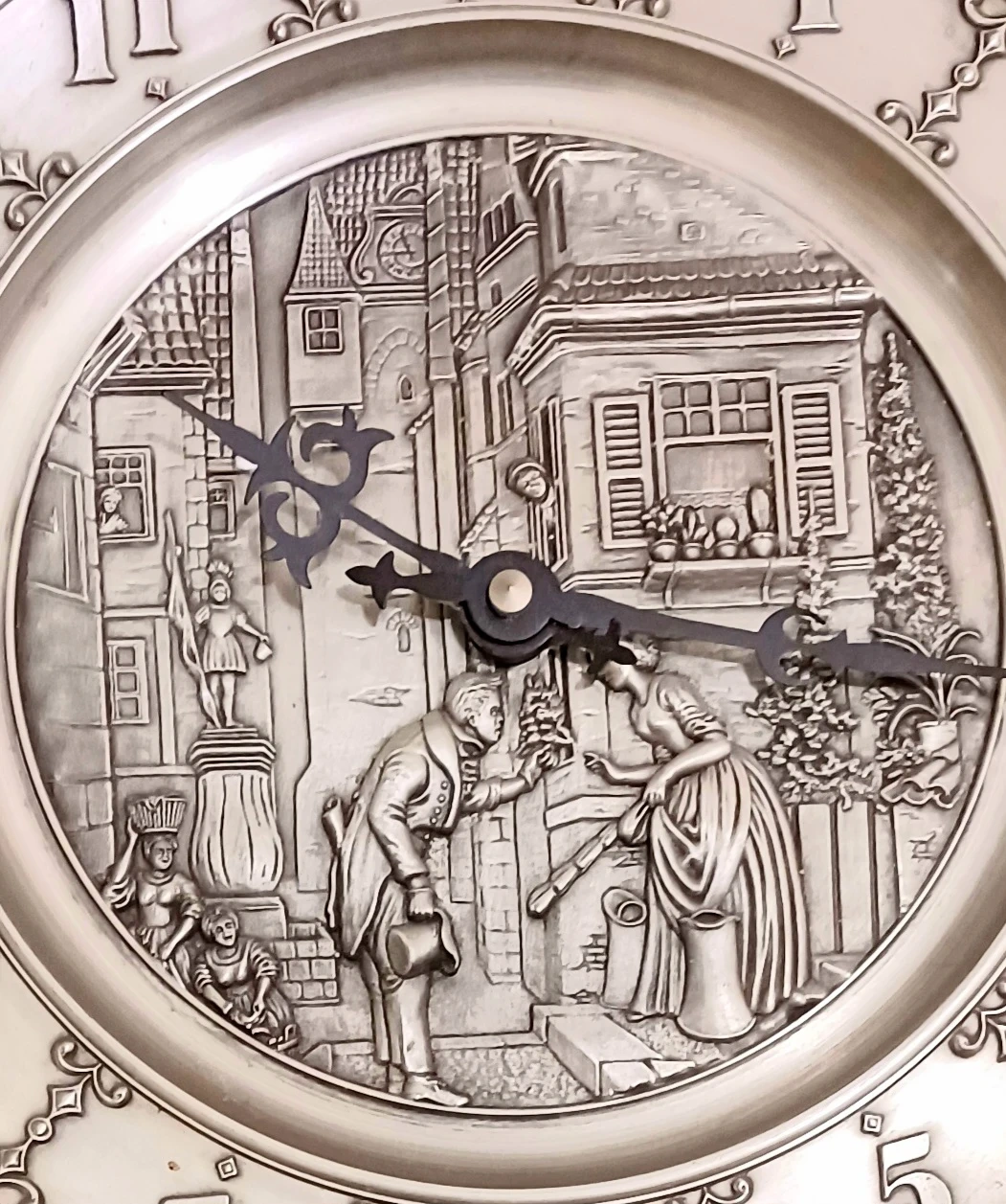 Add a touch of European charm to your home with this vtg German wall clock, featuring a detailed scene and classic Roman numerals.