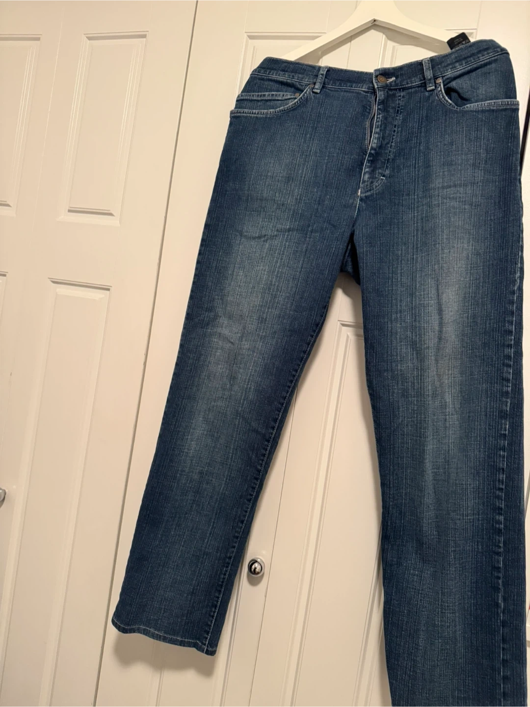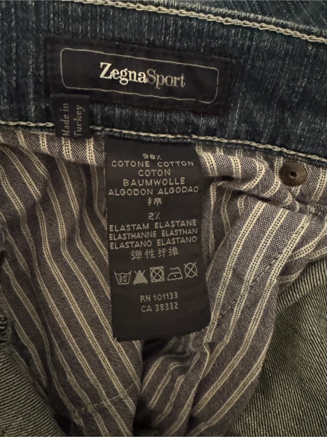 These are Zegna Sport jeans in a size 36 waist. They're made from 98% cotton and 2% elastane for a comfortable fit. They're perfect for everyday wear.