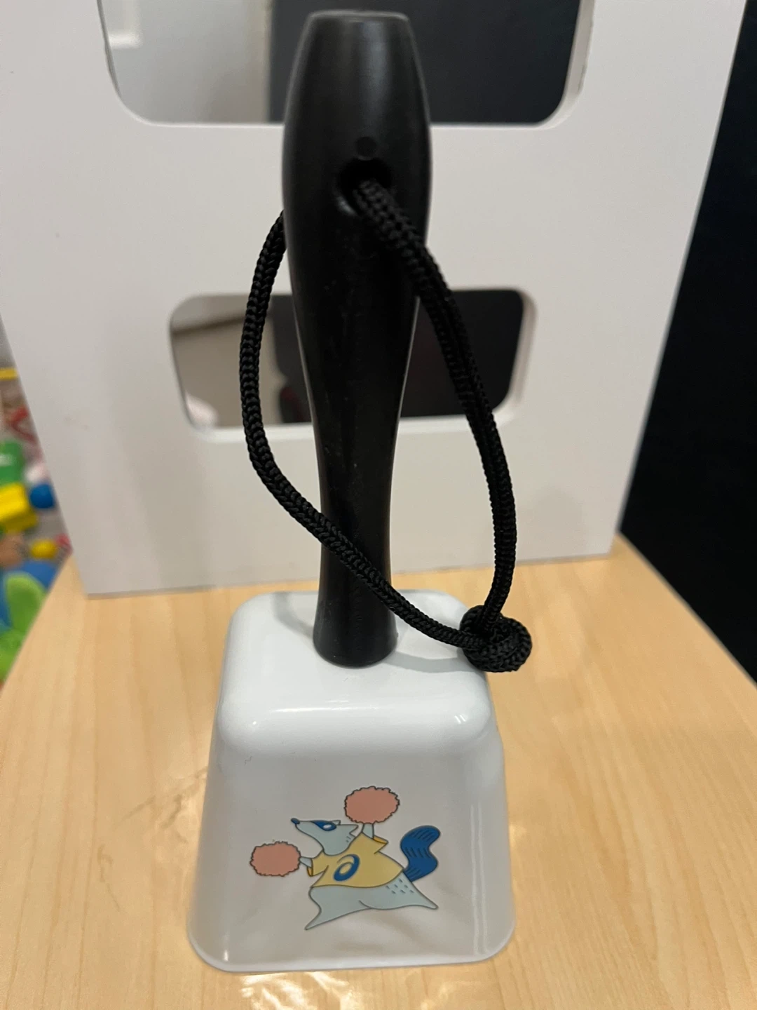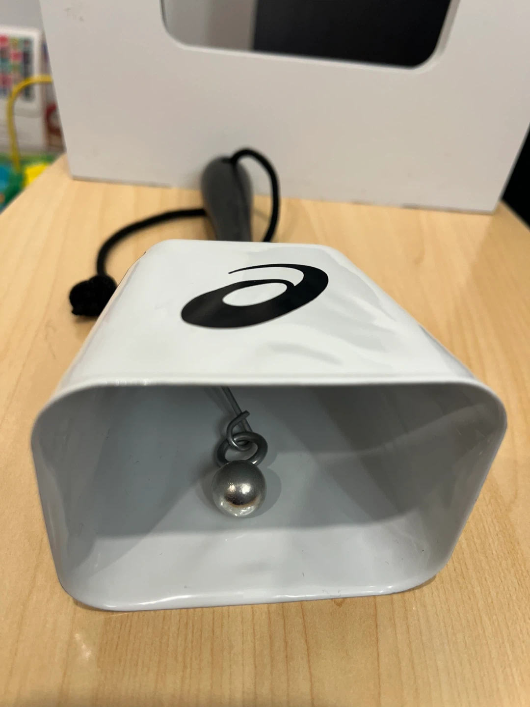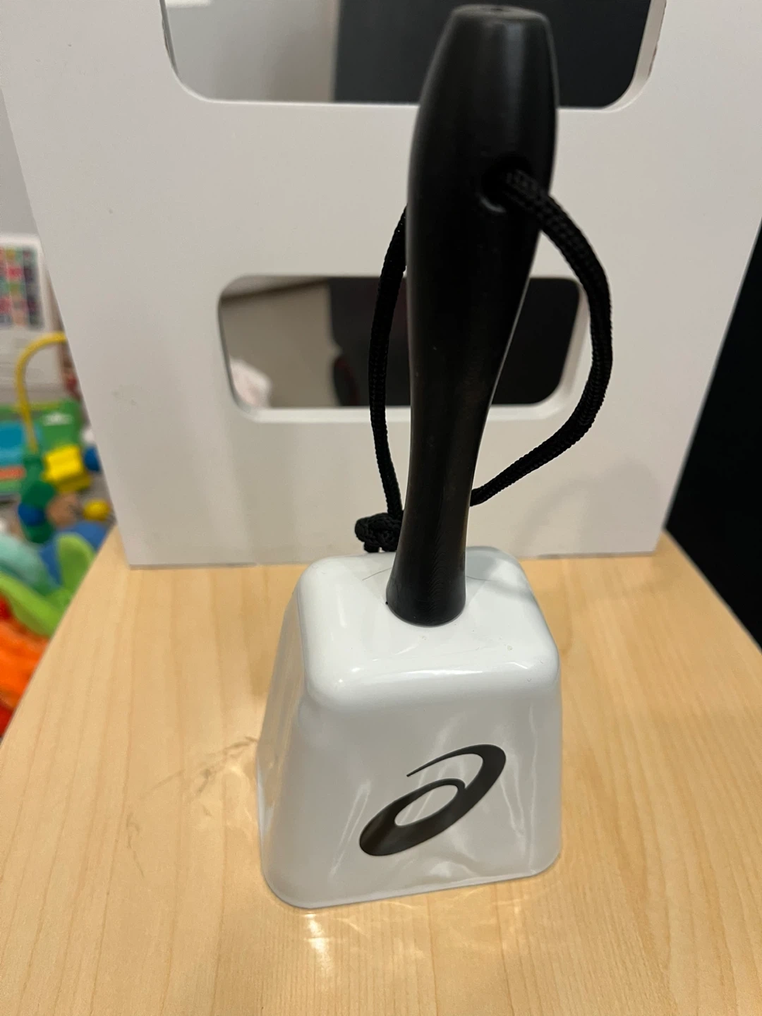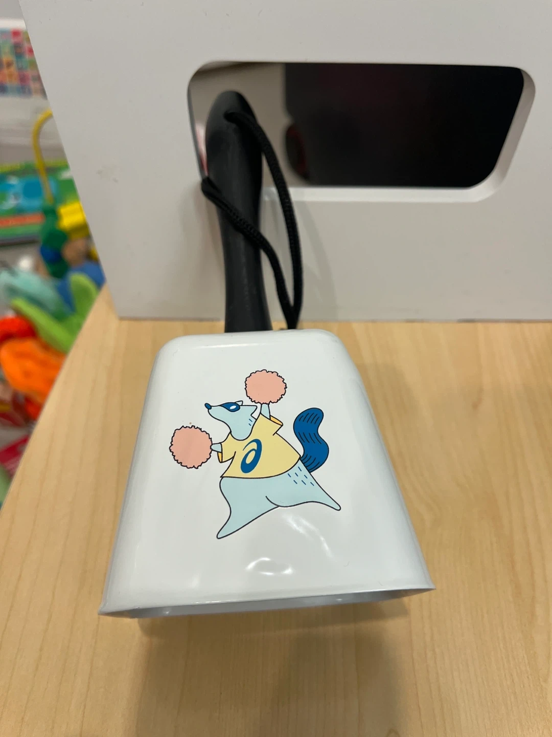 This is an Asics cowbell with a white body and a black handle. It features the Asics logo and a cartoon mascot holding pompoms. It's perfect for cheering at sporting events or just for fun!