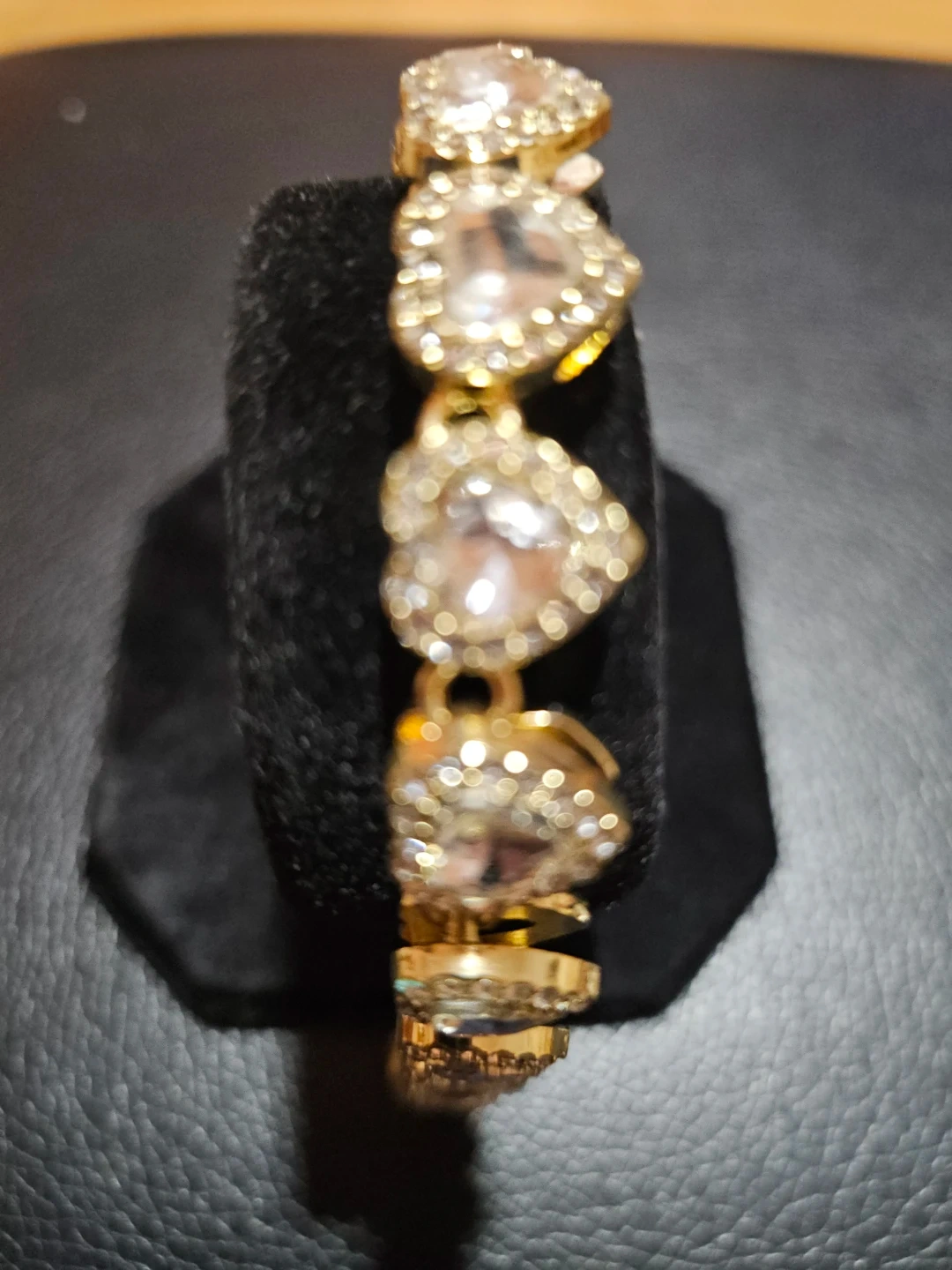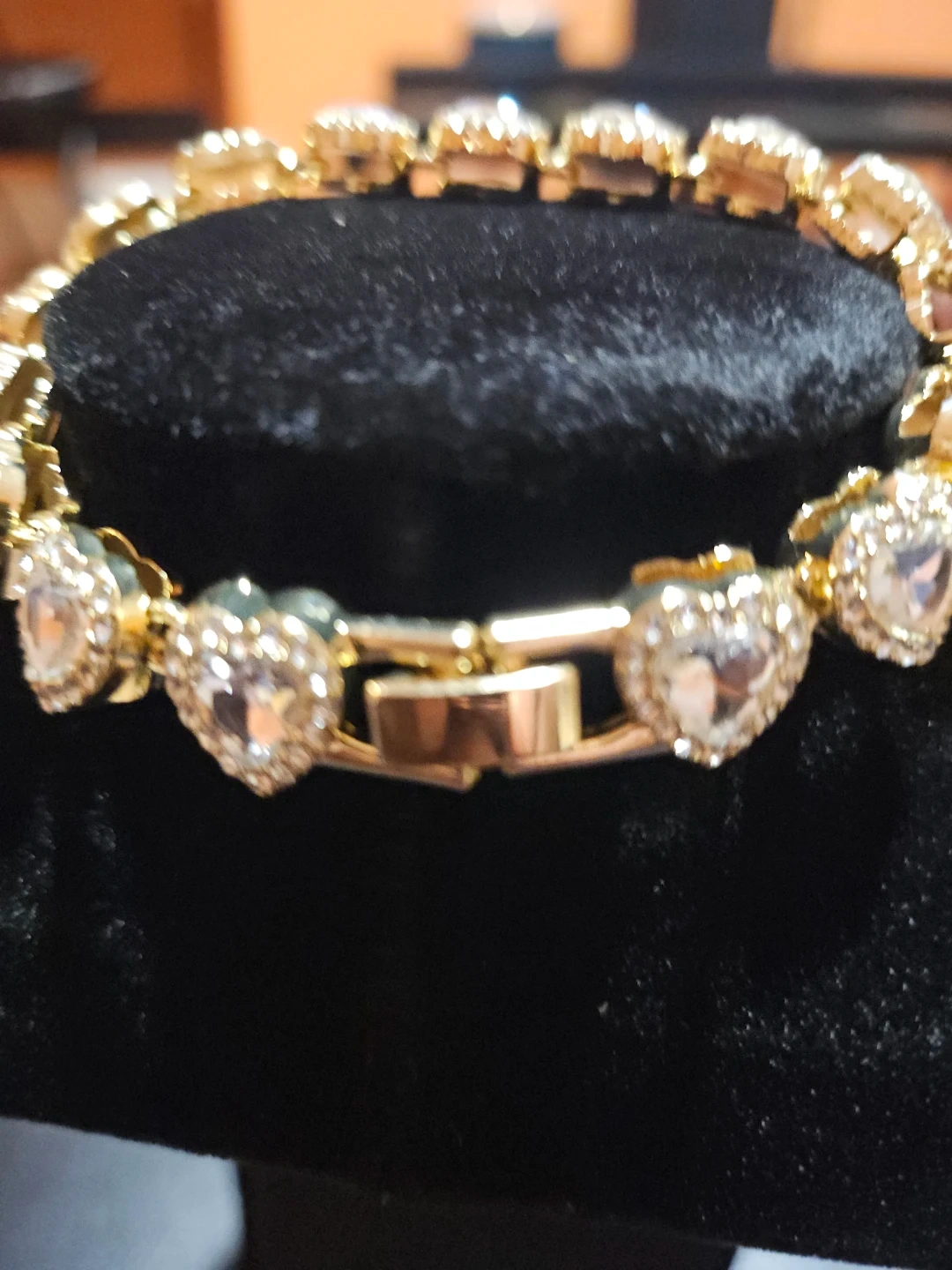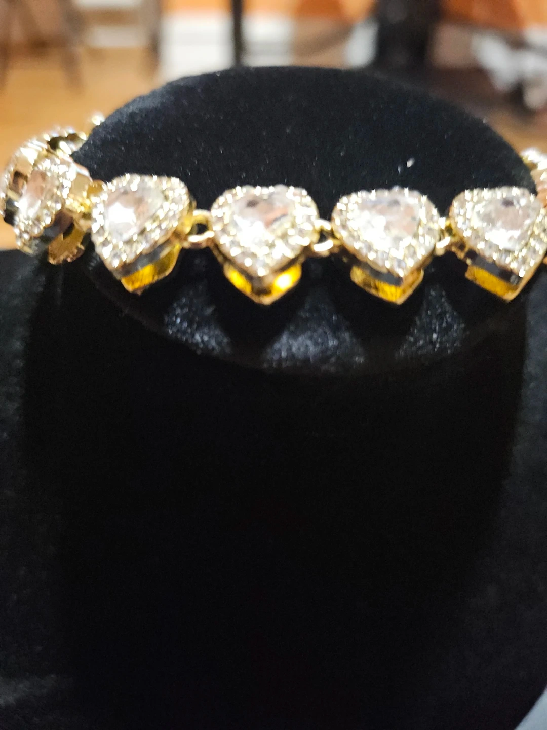 Sparkling gold tone bracelet featuring heart-shaped crystals. It's secured with a fold-over clasp. A beautiful accessory for any occasion!