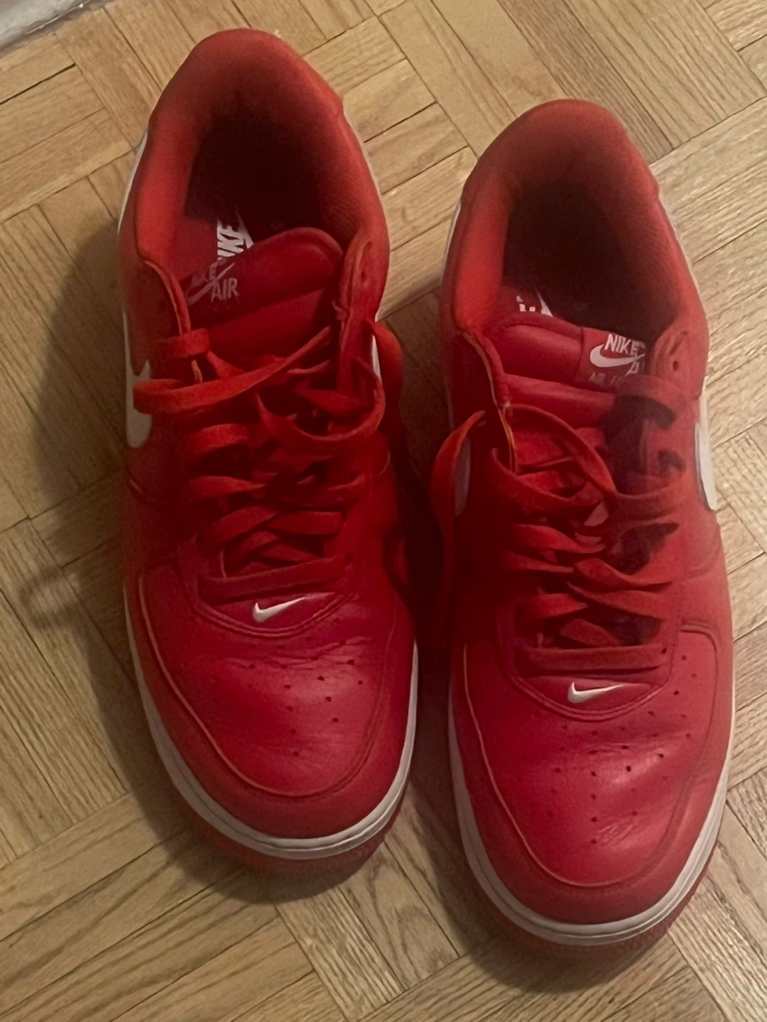 Classic red Nike Air Force 1 sneakers. Leather upper with white accents and rubber sole. Low-top design.