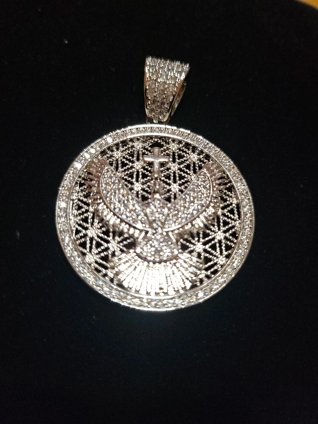 This pendant features an intricate eagle design with a cross at its center. It's detailed with small, sparkling stones around the outer edge. The metal appears to be silver-toned. This piece offers a striking visual appeal.