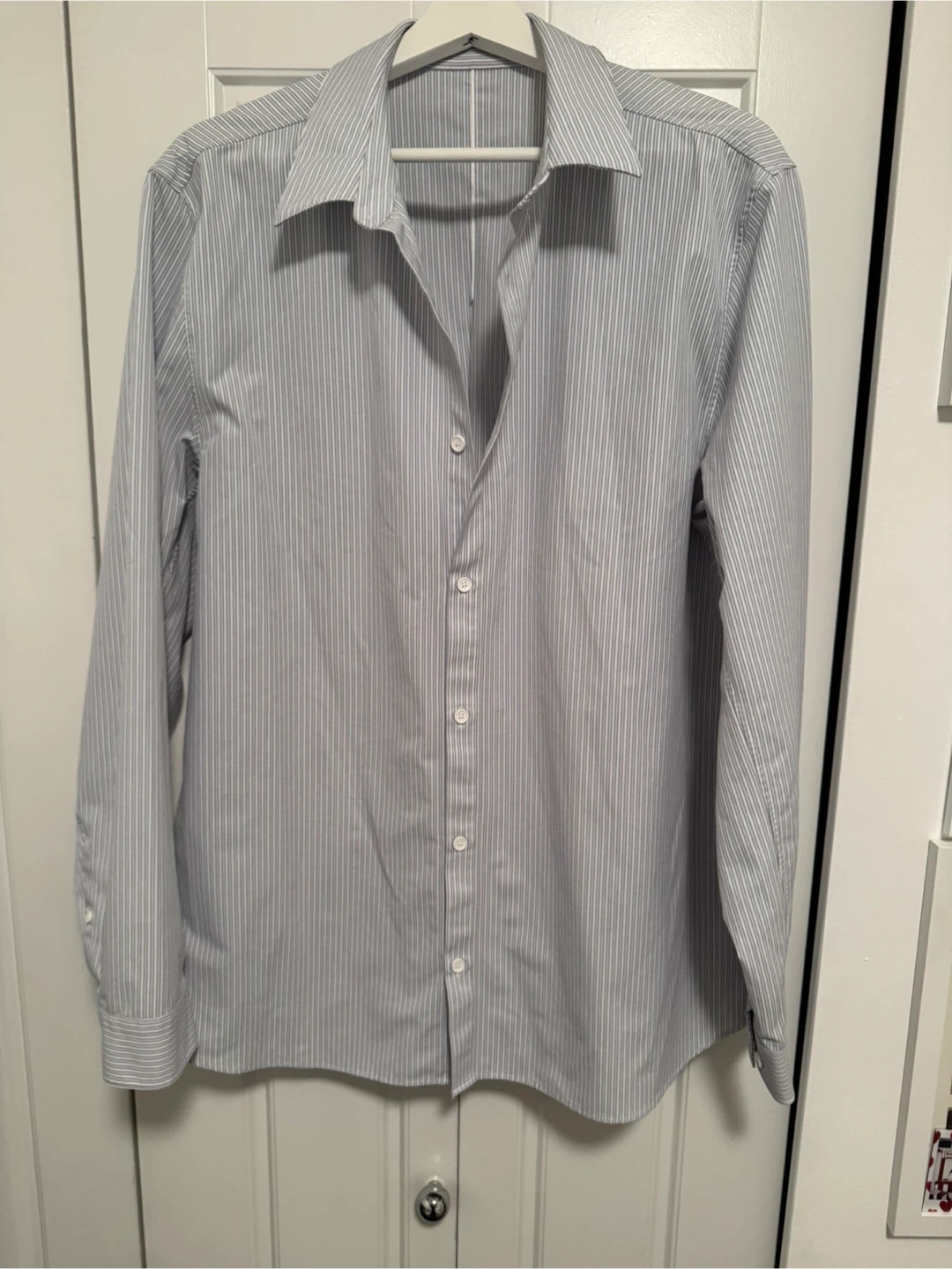 This is a men's long-sleeved dress shirt with a classic blue and white pinstripe pattern. It features a button-down front and a pointed collar. Material appears to be a cotton blend.