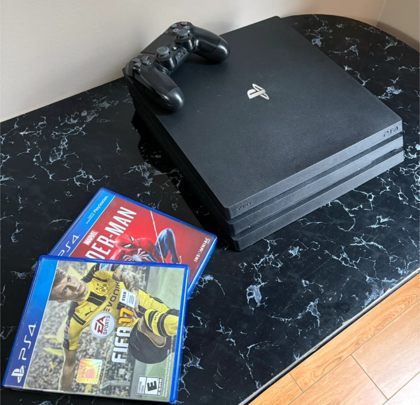 Selling a Sony PlayStation 4 Pro console, 1TB storage. It comes with a DualShock 4 controller and two games: Marvel's Spider-Man and FIFA 17.