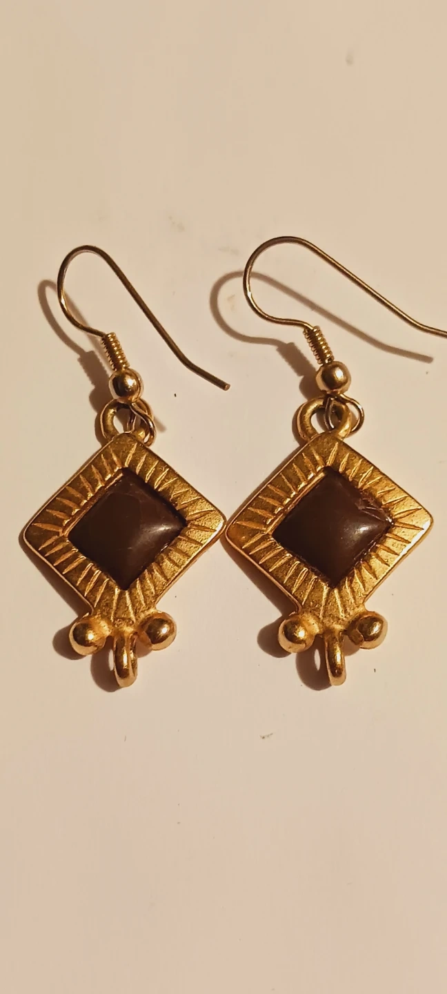 These dangle earrings feature a gold tone metal with a dark brown diamond shaped inlay. The earrings have a hook closure. They're about 1.5 inches long. Excellent condition. ALL MY PRICES ARE NEGOTIABLE !!