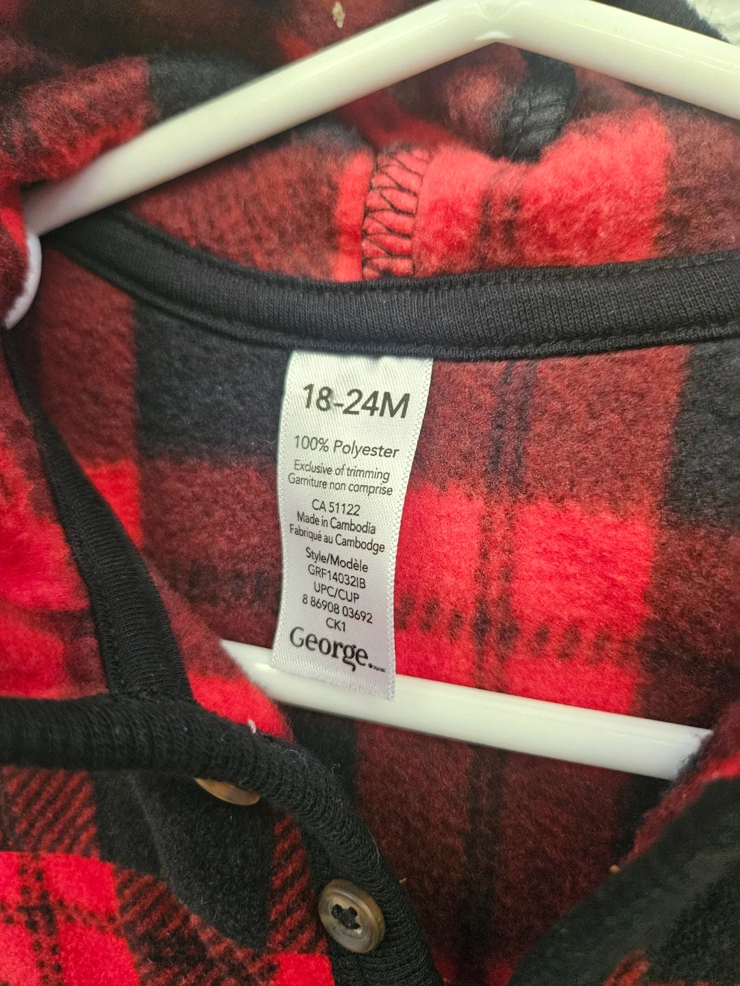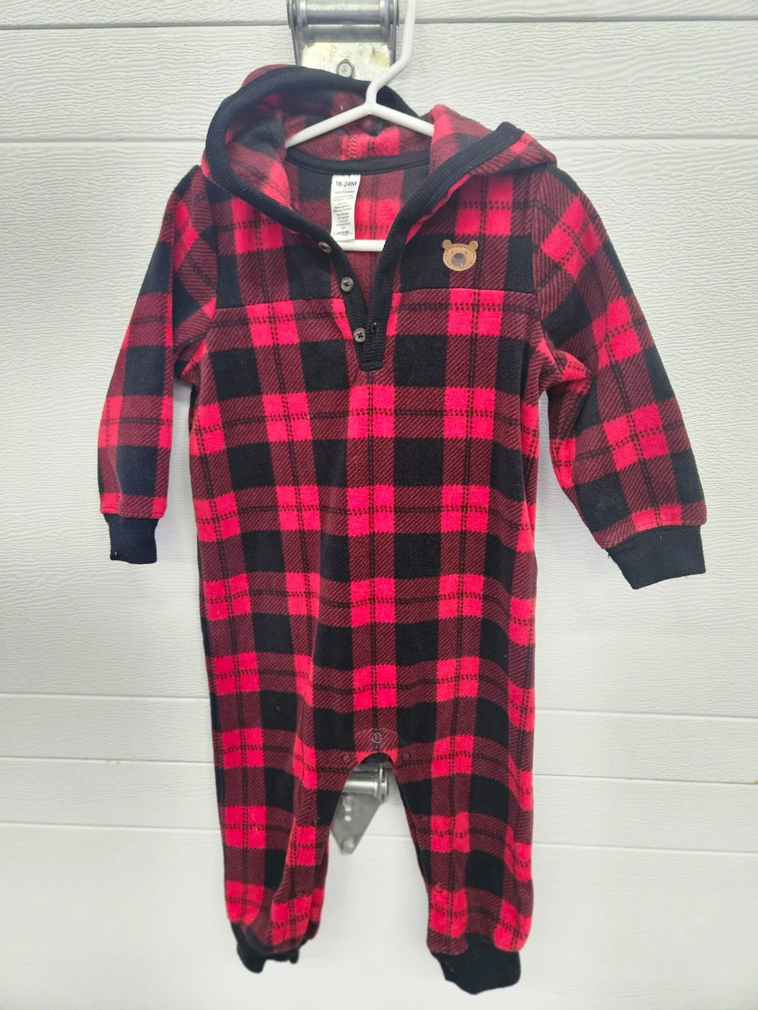 Cozy red and black plaid fleece sleepsuit by George. It's a hooded one-piece with button closure at the neck and ribbed cuffs. Made from 100% polyester.
