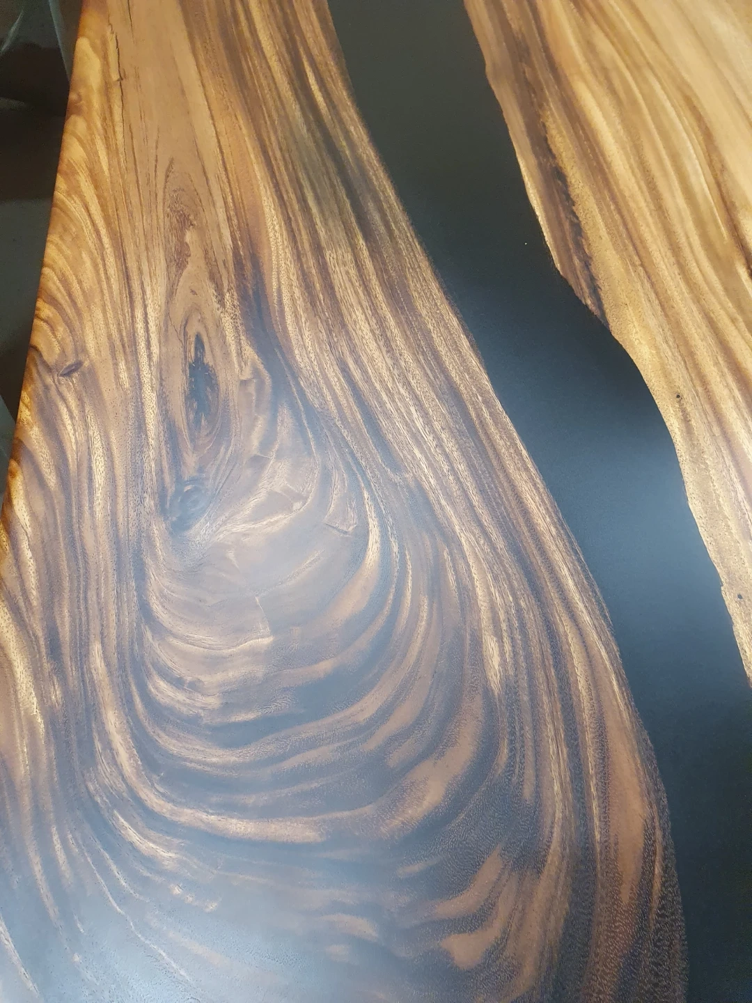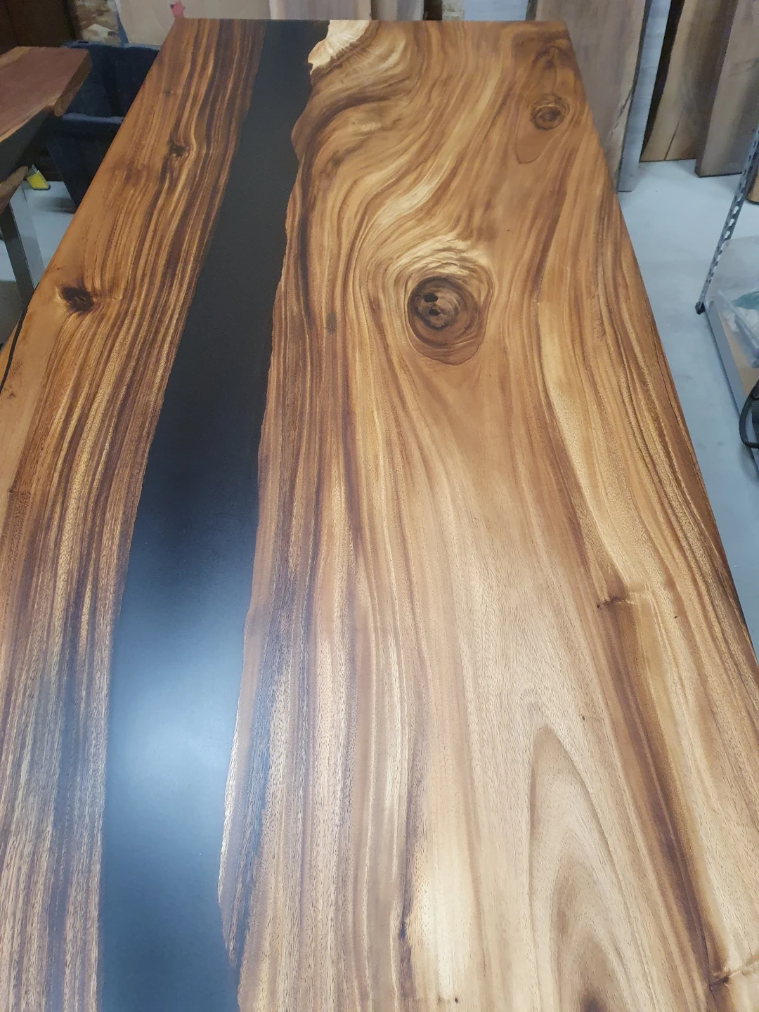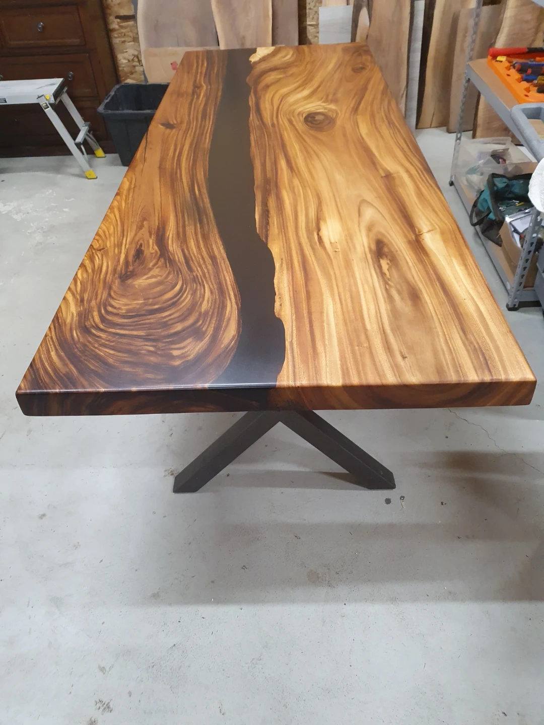 Beautiful live edge dining table featuring a striking dark epoxy river. Its natural wood grain and sleek design make it a unique centrepiece for any dining space. The sturdy metal legs provide excellent support.