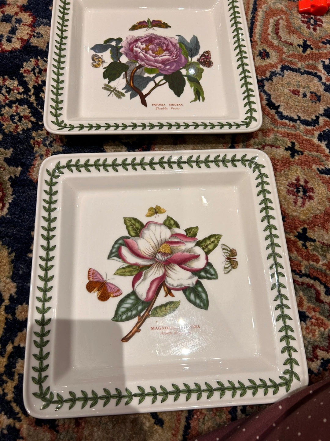 Two square decorative plates featuring botanical illustrations of a Paeonia Moutan and a Magnolia Stellata. Both plates are adorned with a classic green vine border. They're perfect for display or adding a touch of nature to your table.