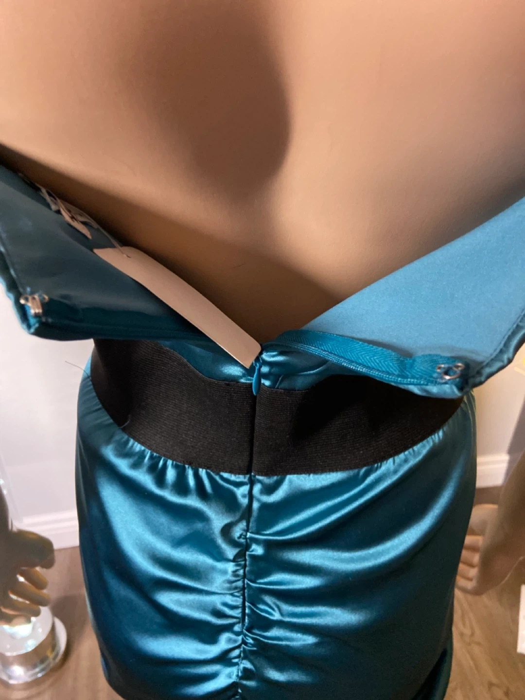 This is a strapless mini dress in a beautiful teal colour from Foley + Corinna. It features ruched detailing and a black elastic waistband. Made of a comfortable, stretchy, silky, satin material.