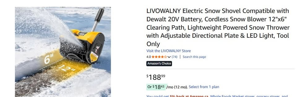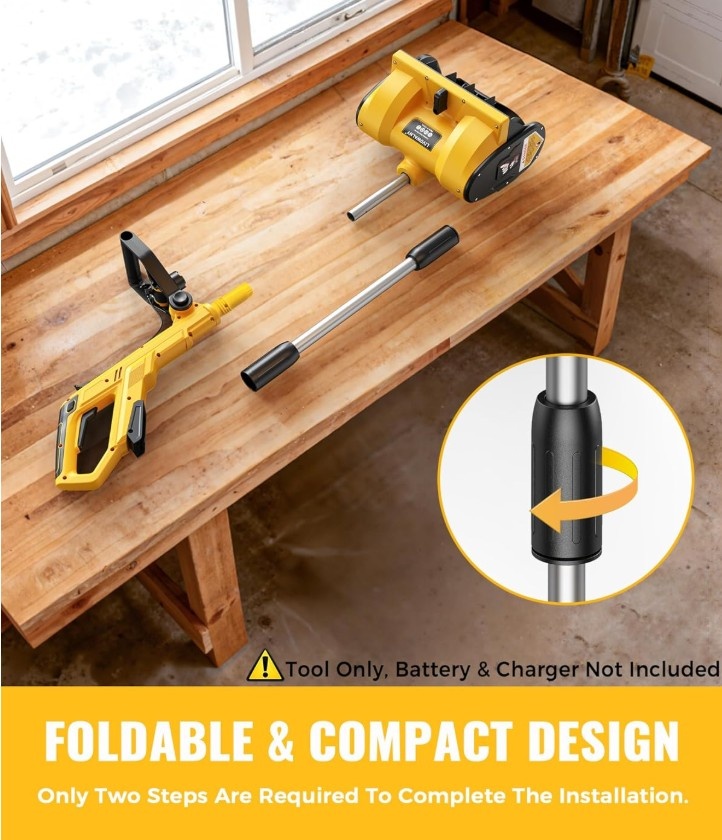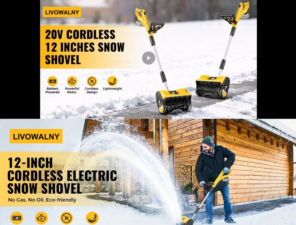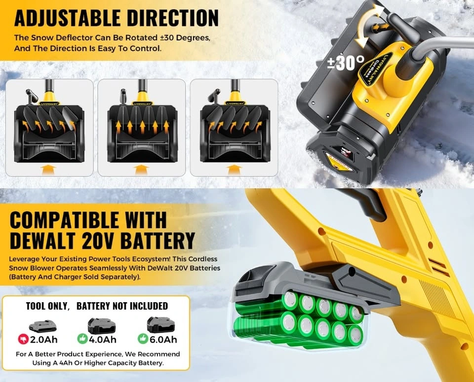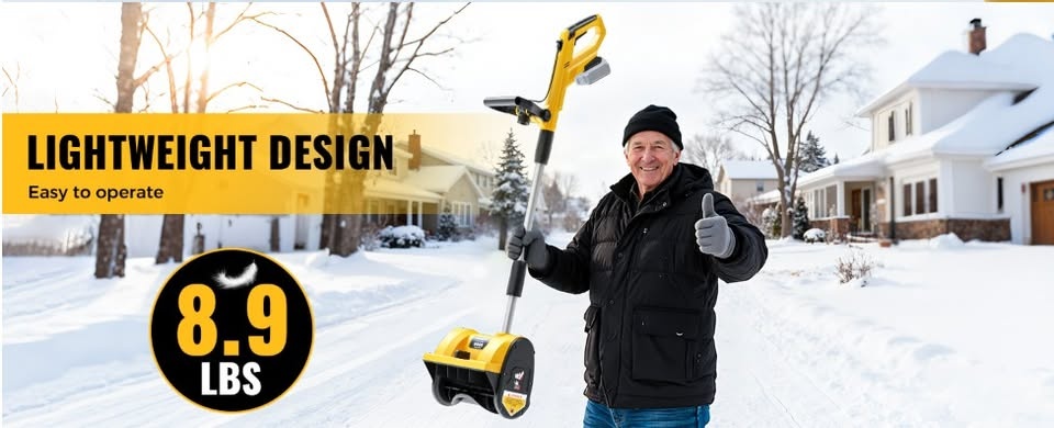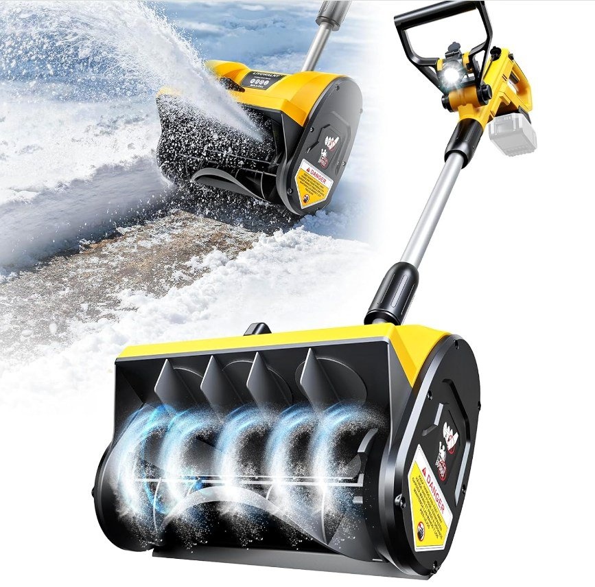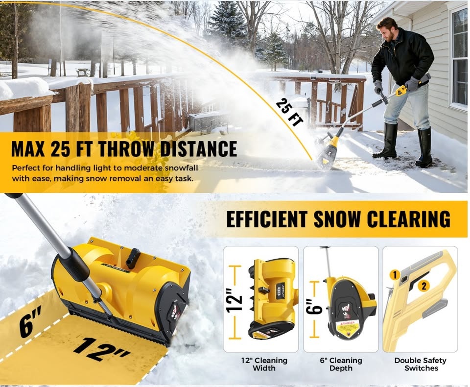 Effortlessly conquer winter with this robust electric snow shovel! Its powerful motor tackles dense snow, clearing a 12-inch wide path and cutting through 6-inch depths in a single pass. Experience the power of a compact snow blower without the hassle of gas or cords. This cordless design ensures convenience and flexibility. Throws snow up to 20 feet away. Easily adjust the discharge chute 30 degrees left or right with a simple lever for precise snow direction. Weighing only 10 pounds, this lightweight snow shovel is easy to lift, carry, and maneuver, even on steps or tight spaces. Its ergonomic, adjustable-angle handle ensures a comfortable grip. It’s easy to assemble and ready to work in minutes. Operates seamlessly with DeWalt 20V batteries (battery and charger sold separately). A 4Ah or higher battery is recommended for extended use. The built-in LED light illuminates your path for safe clearing in low-light conditions. Perfect for clearing driveways, steps, patios, decks, sidewalks, walkways, and other tight areas where larger equipment can't reach. Let me know if you're interested!