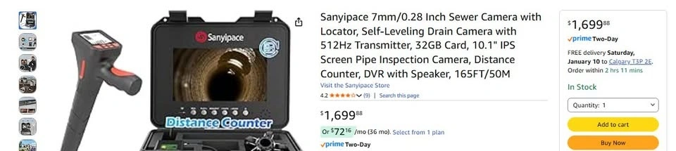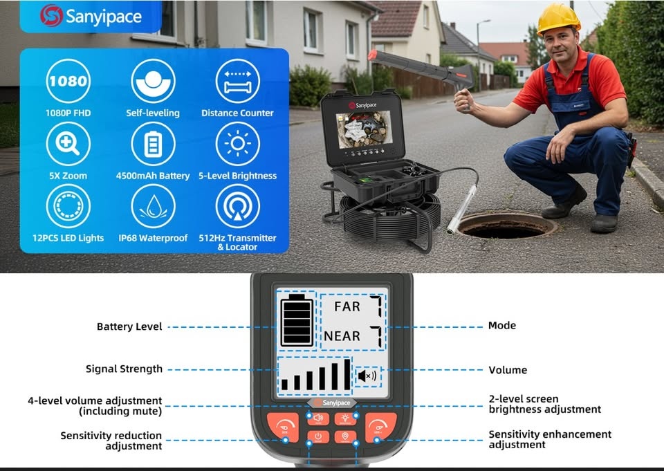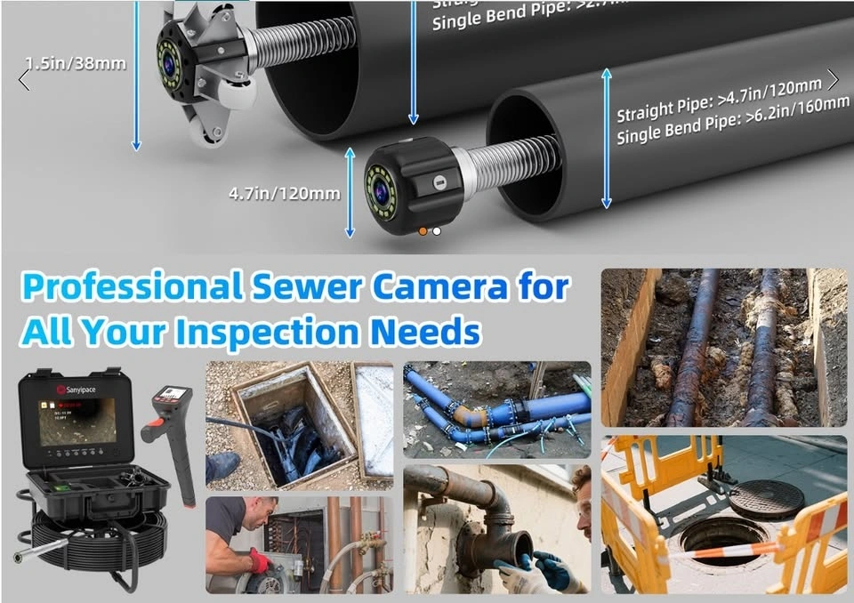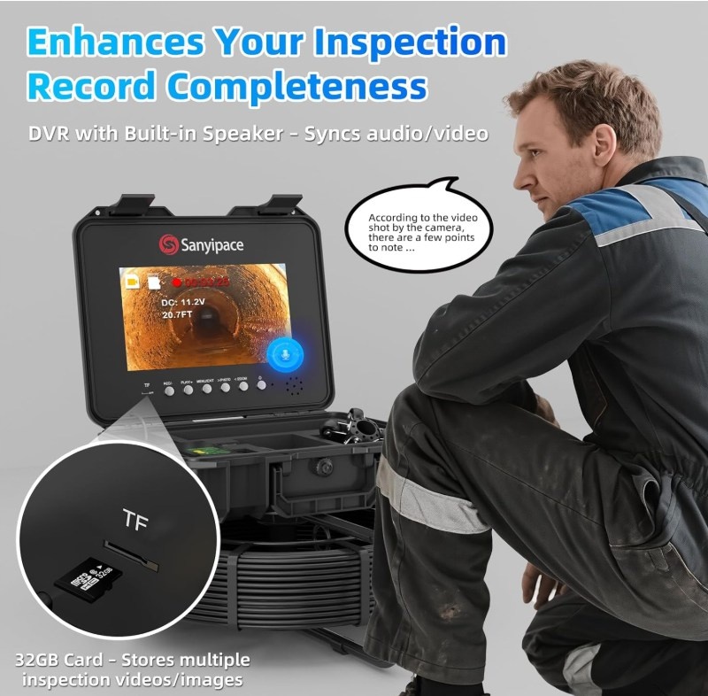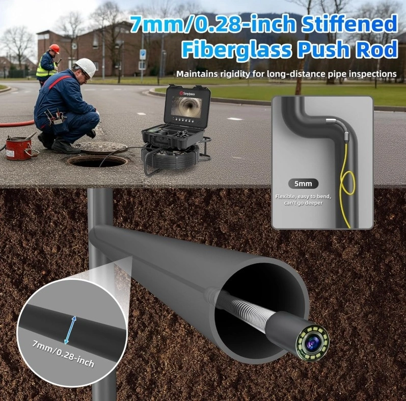 Advanced 512Hz Pipe Locator System - This drain pipe camera includes a built-in 512Hz transmitter and a pipe locator with a 3.5" screen, allowing you to locate damaged areas instantly, even through PVC/concrete pipes. Supports switching between Far Mode (16.5ft/5m range) or Near Mode (3.3ft/1m range) for pinpoint accuracy. Upgraded 7mm Cable & Probe Design – The 7mm/0.28-inch semi-rigid fiberglass push rod provides strong pushing/pulling force to easily cross long pipes, while the cone-shaped camera probe end design reduces sticking risks for smoother inspections. Features a built-in distance counter to monitor cable length in real time. Enhanced Inspection Experience - The built-in self-leveling function ensures images stay perfectly upright at all times for optimal visibility. The 10.1" IPS large screen delivers wide, ultra-clear visuals. See Every Detail in Dark Pipes – This sewer line camera features 12 high-intensity LEDs and a 145° wide-angle lens to capture crystal-clear images in pitch-dark pipes. 5x digital zoom enables detailed analysis of cracks, corrosion, and blockages for precise diagnostics. All-in-One Professional Plumbing Inspection Camera Set - Comes with a 32GB card for instant on-device playback and computer transfer. Includes date and time stamp function for record-keeping.