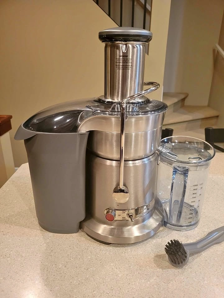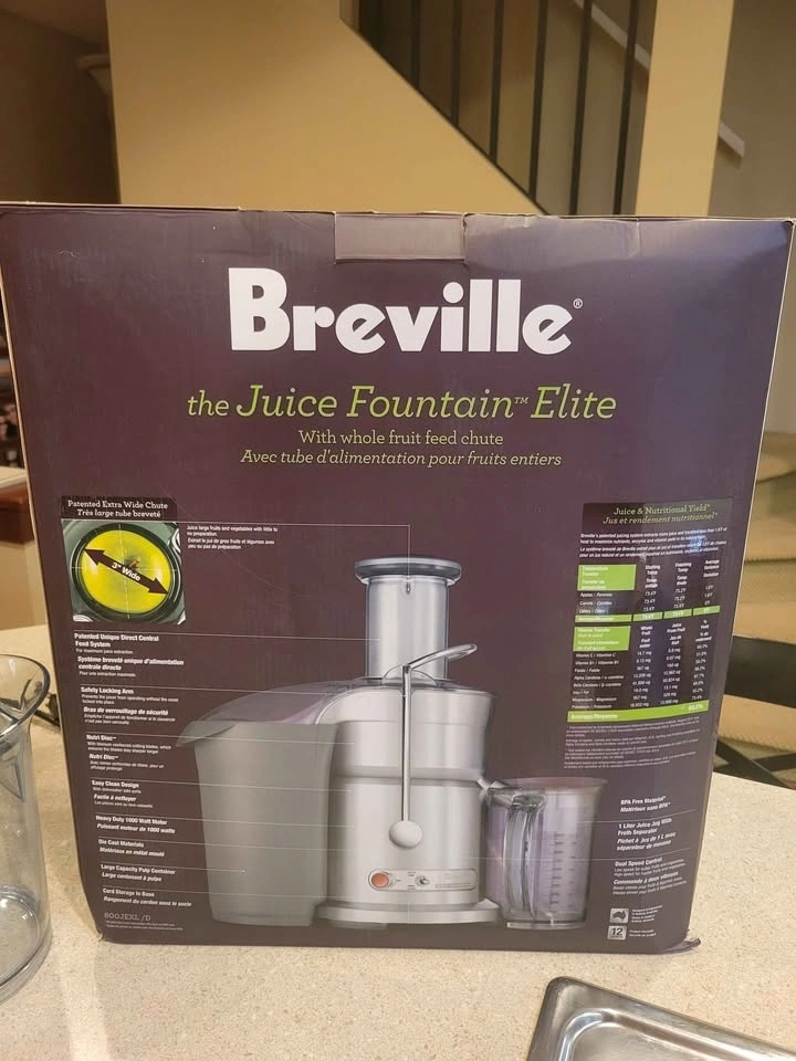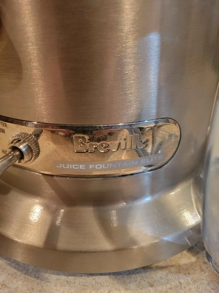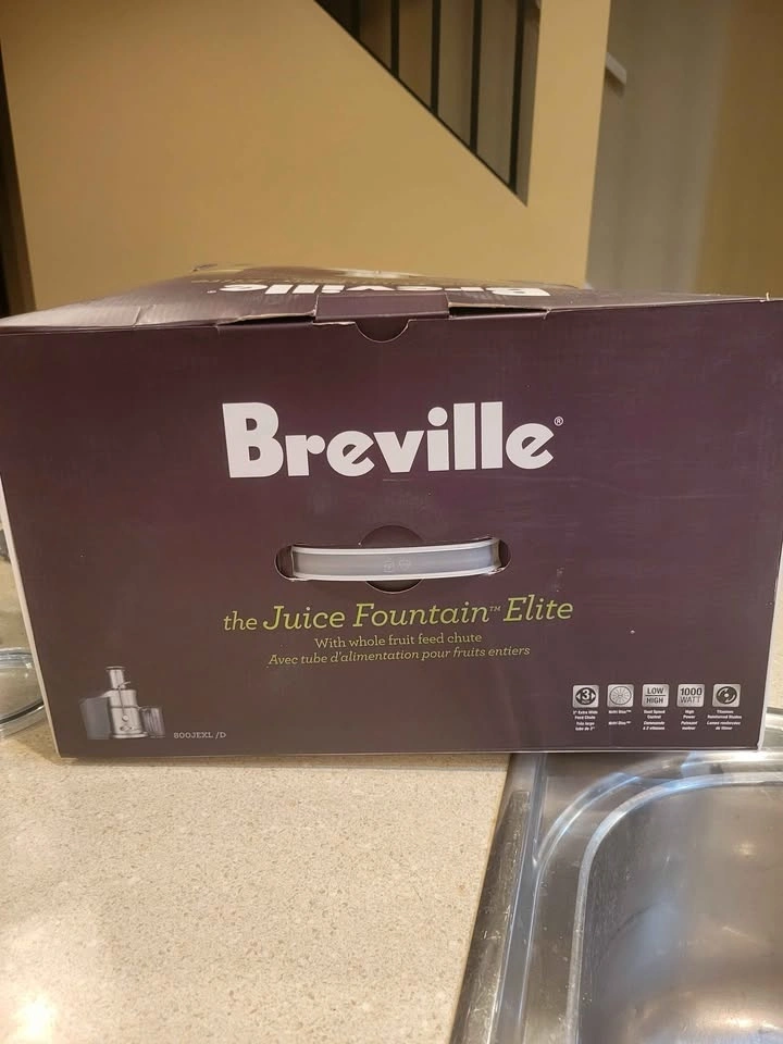 Breville Juice Fountain Elite (Model 800JEXL) centrifugal juicer. Features a heavy-duty 1000-watt motor with dual-speed control (low 6,500 RPM for soft produce, high 13,000 RPM for hard fruits and vegetables). Patented extra-wide 3-inch feed chute for juicing large items with minimal prep. Durable and stylish brushed stainless steel construction. Produces up to 30% more juice than traditional juicers. Feel free to message if you have any questions!