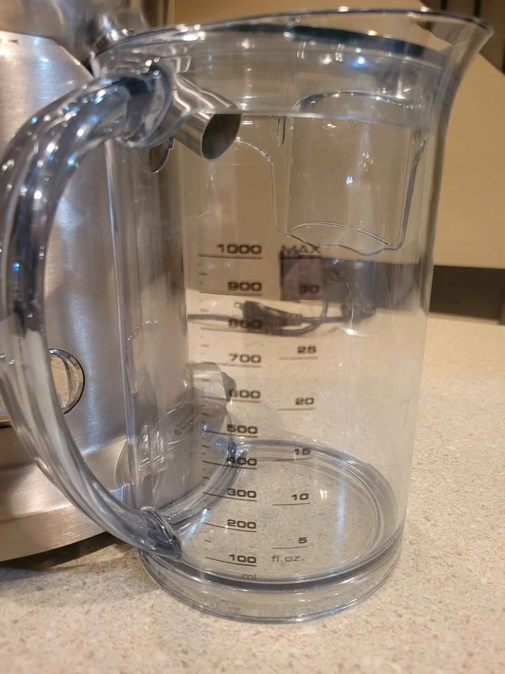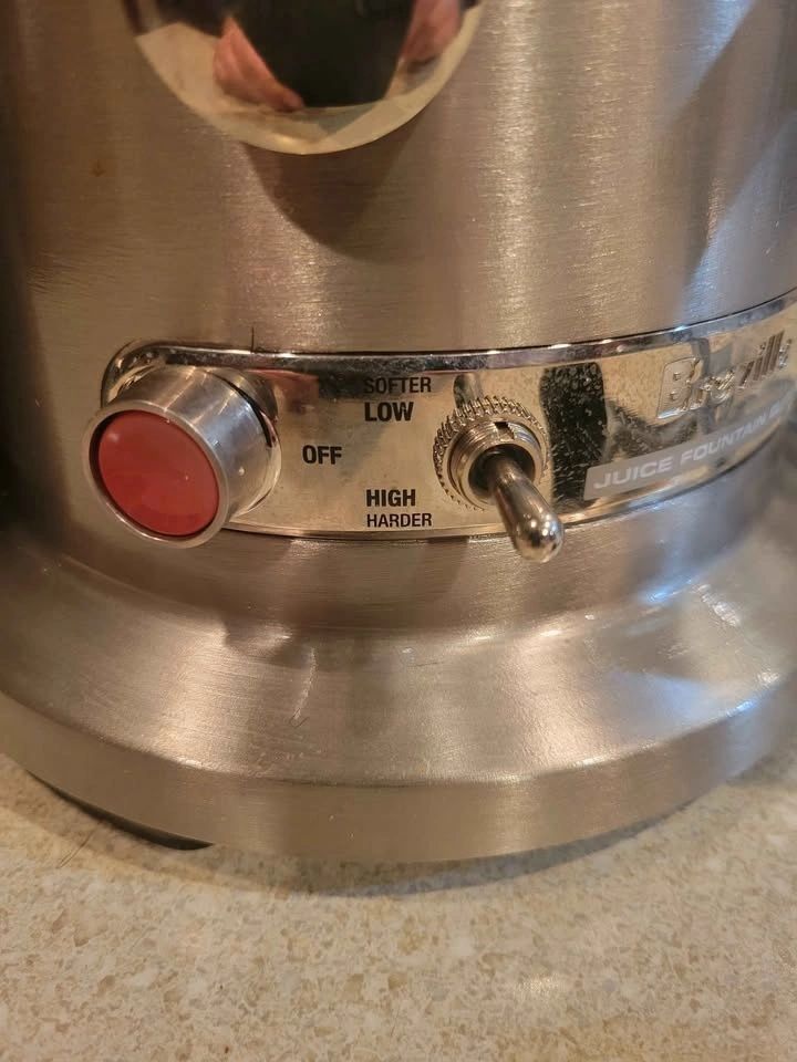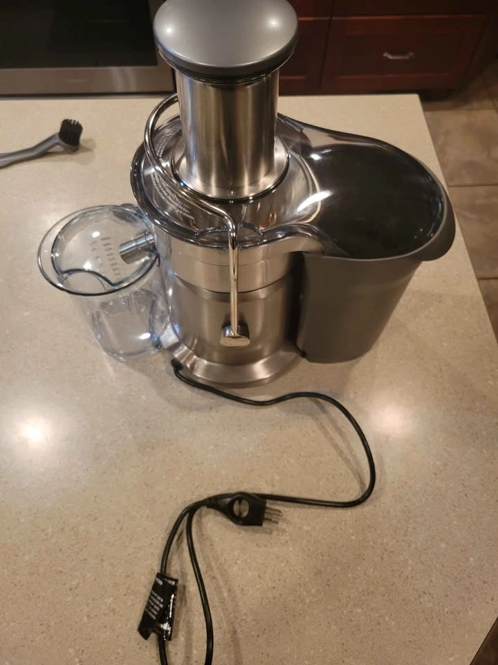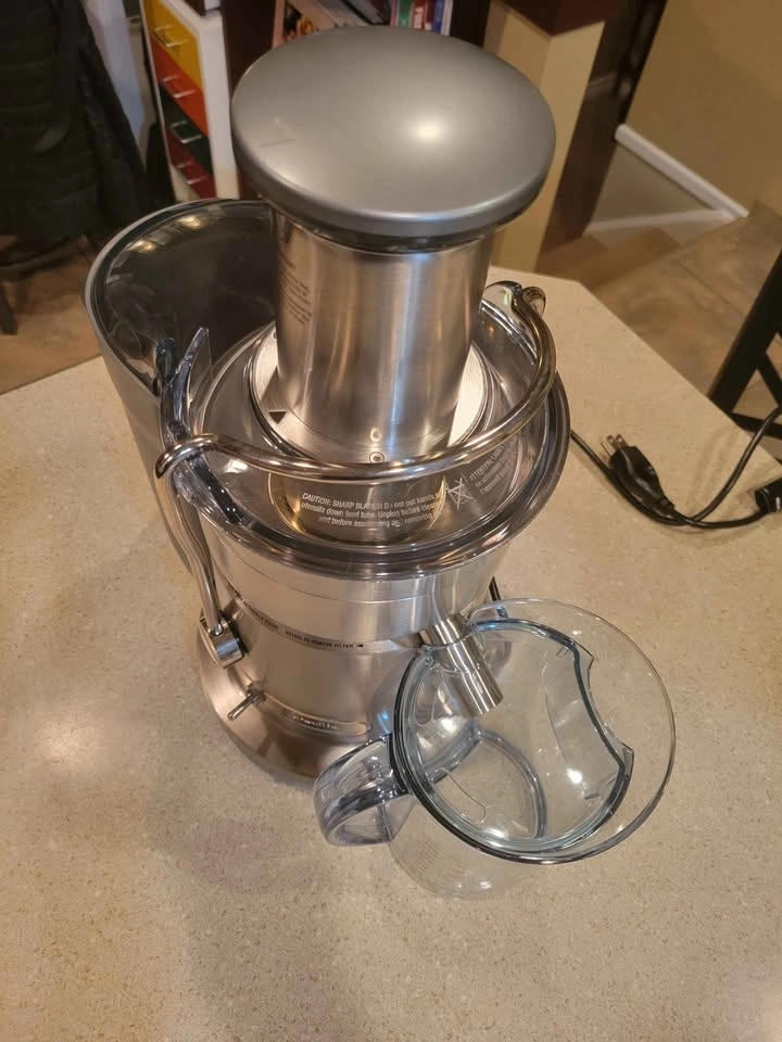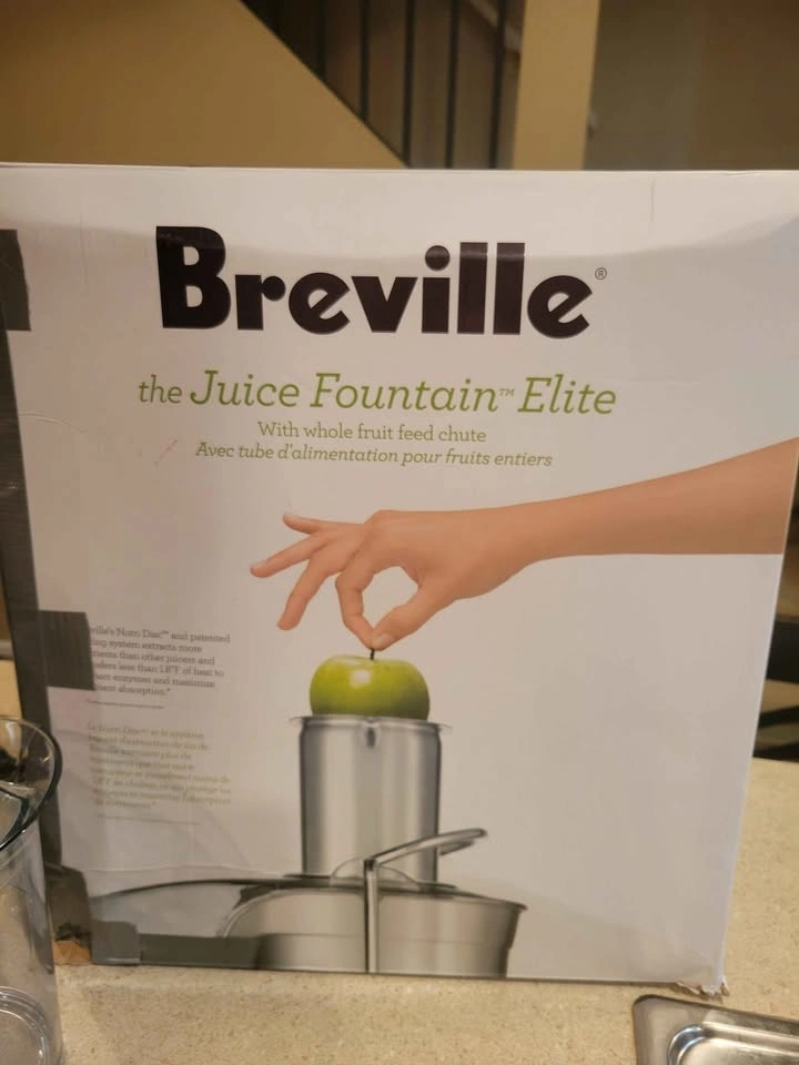 Breville Juice Fountain Elite (Model 800JEXL) centrifugal juicer. Features a heavy-duty 1000-watt motor with dual-speed control (low 6,500 RPM for soft produce, high 13,000 RPM for hard fruits and vegetables). Patented extra-wide 3-inch feed chute for juicing large items with minimal prep. Durable and stylish brushed stainless steel construction. Produces up to 30% more juice than traditional juicers. Feel free to message if you have any questions!