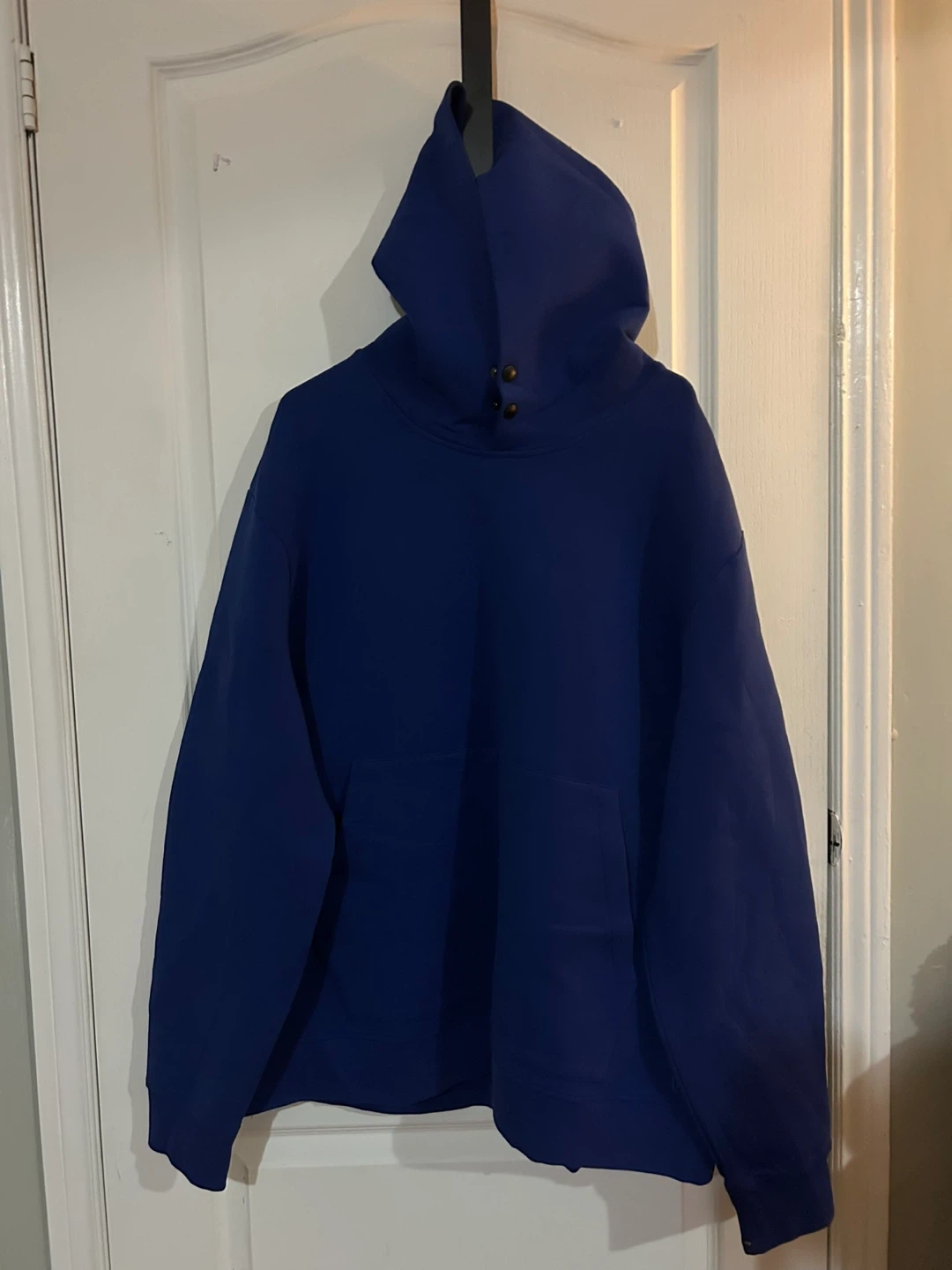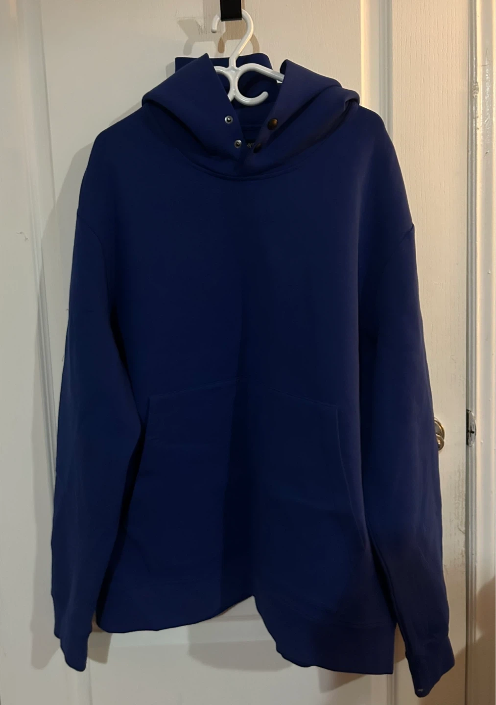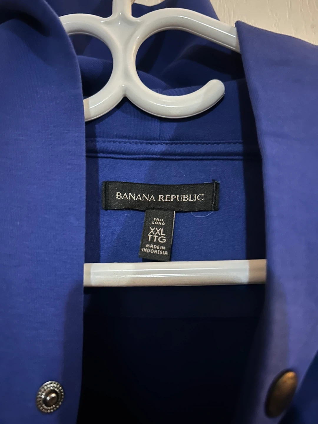 Brand new Banana Republic hoodie in a deep blue colour. It's a size XXL Tall and made in Indonesia. This pullover style features a front pocket and snap closure at the neck.