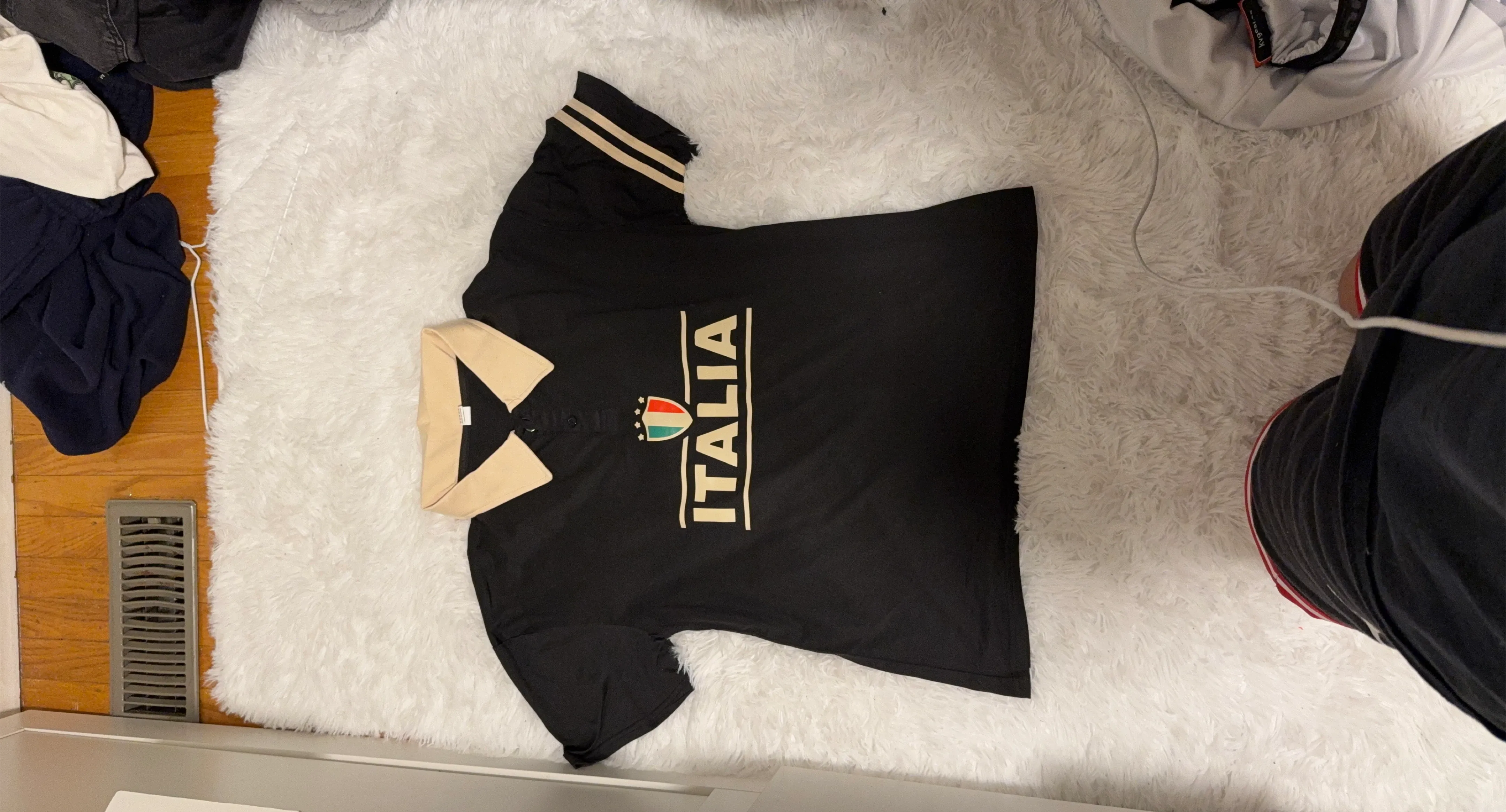 A black polo shirt featuring 'Italia' text and a crest with the Italian flag colours. It has a tan collar and striped tan cuffs. Made from a comfortable fabric blend.