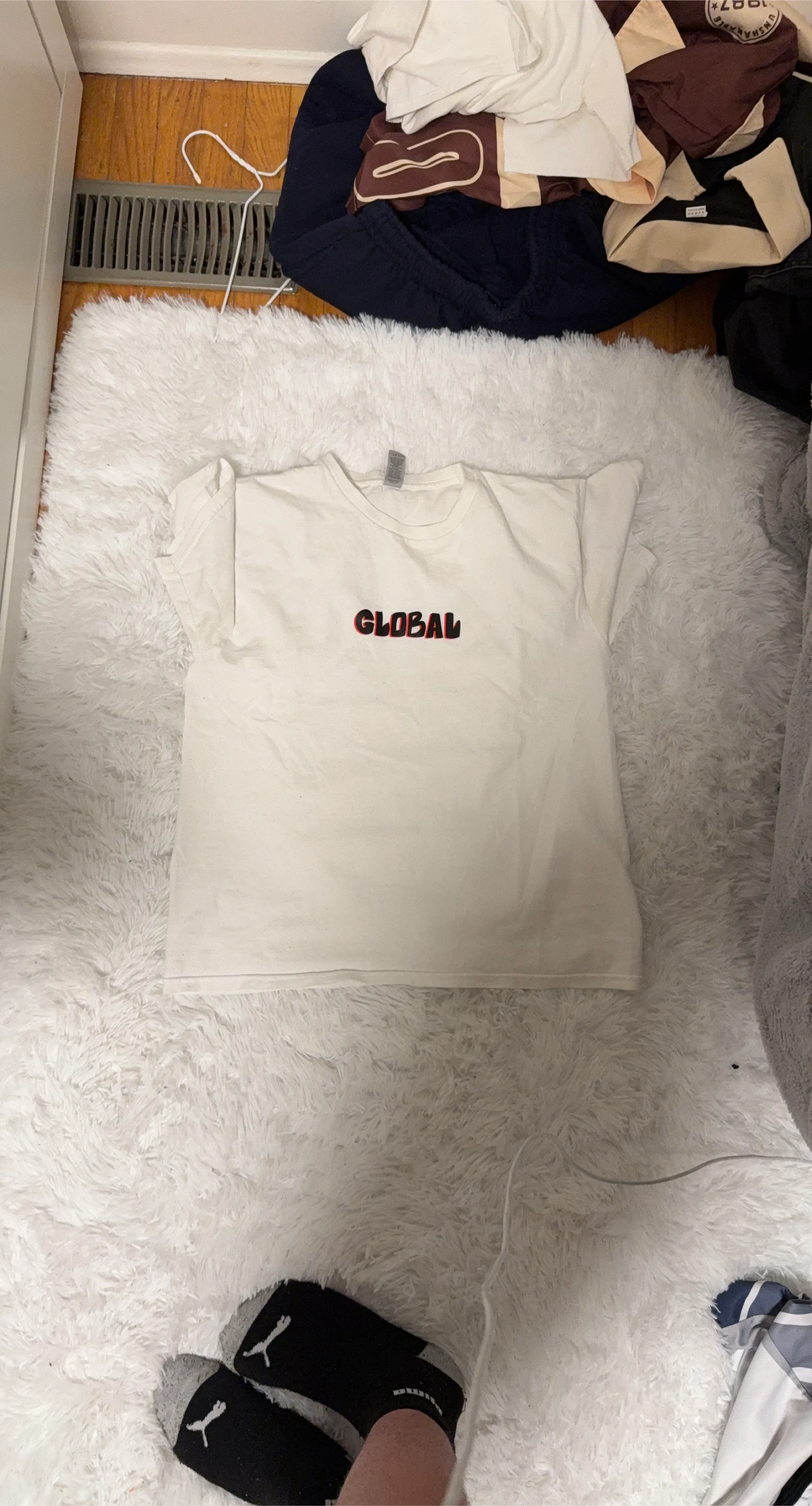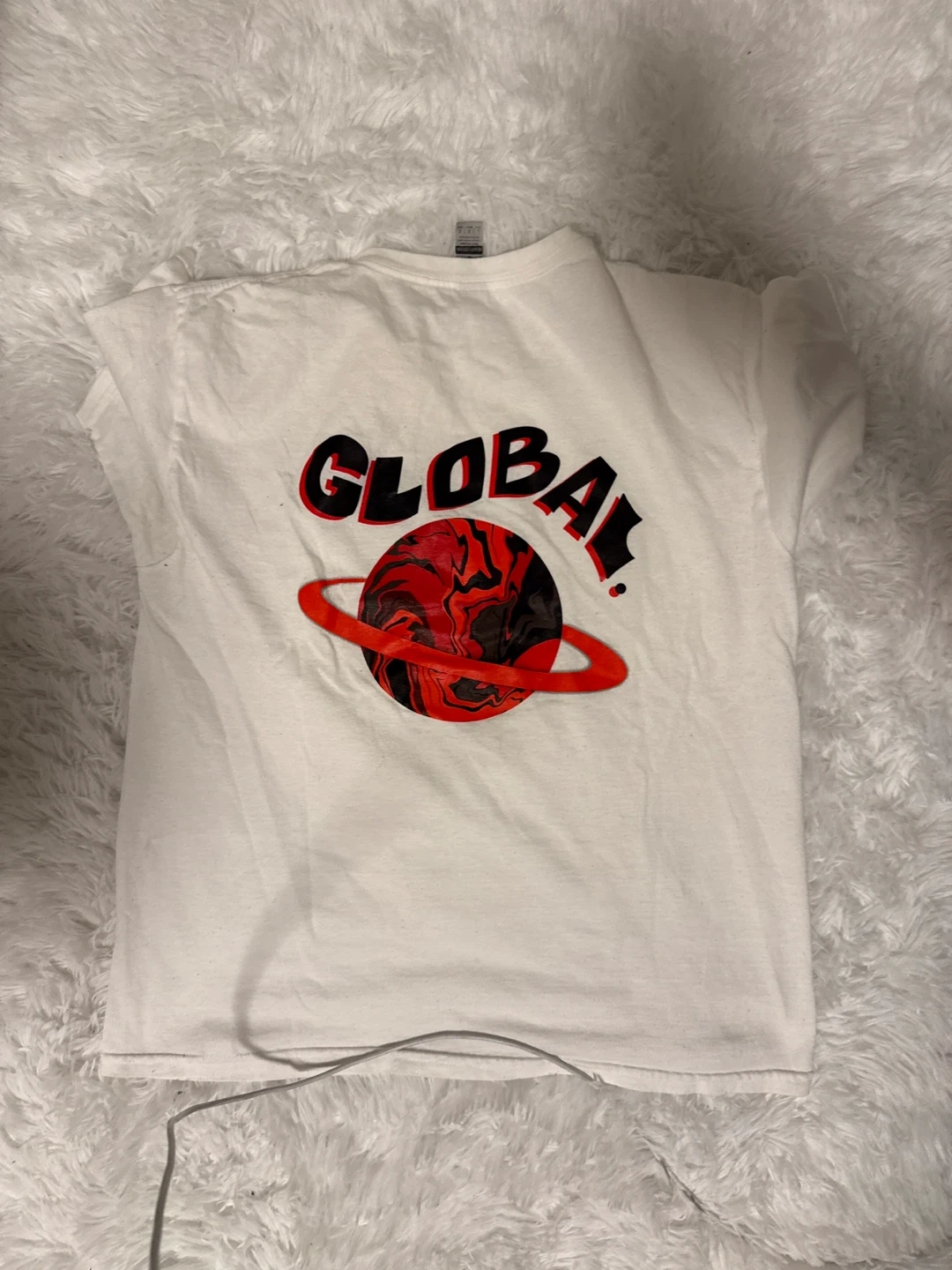 White short-sleeved t-shirt with 'GLOBAL' text on the front. Back features a 'GLOBAL!' graphic with a planet and ring design. Cotton material.