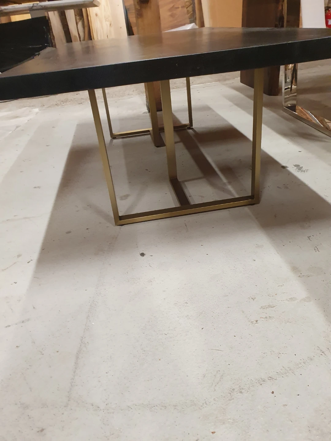 Solid dark wood coffee table with a striking gold metal base. It's perfect for family dinners and entertaining guests. The sturdy construction ensures durability for years to come.