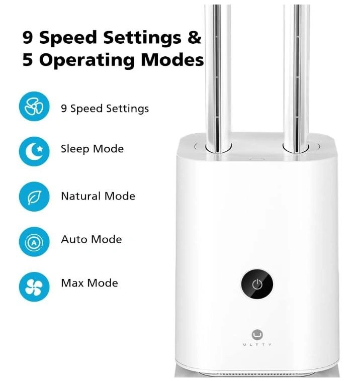 This ULTTY Bladeless Fan offers a smooth breeze, comfortable cooling, and is safe for children and pets. It also functions as an H13 HEPA air purifier, CARB certified. Features 3 modes, 9 speeds, low noise (<32db), an 8-hour timer, and 90° oscillation. Control via LED touch-screen or remote. Cleans air in rooms up to 450 sq.ft, 5 times per hour. Ideal for bedrooms, offices, dorms, and nurseries. Please note: the original remote is lost.
