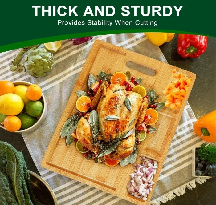 Large Bamboo Cutting Board for Kitchen, with 3 Built-in Compartments and Juice Grooves. Heavy Duty Chopping Board for Meats, Bread, Fruits. Butcher Block, Carving Board (16.9*12.5in-With Handle). EXTRA LARGE AND THICK FOR ALL MEATS, BREAD, FRUITS, VEGGIES. The cutting board measures 17x12.6x0.72 inch (43*31.5*1.8cm) and is big, thick, and sturdy. Could be used as a cutting, chopping, or carving board, cheese board, heavy duty butcher block, or serving tray.