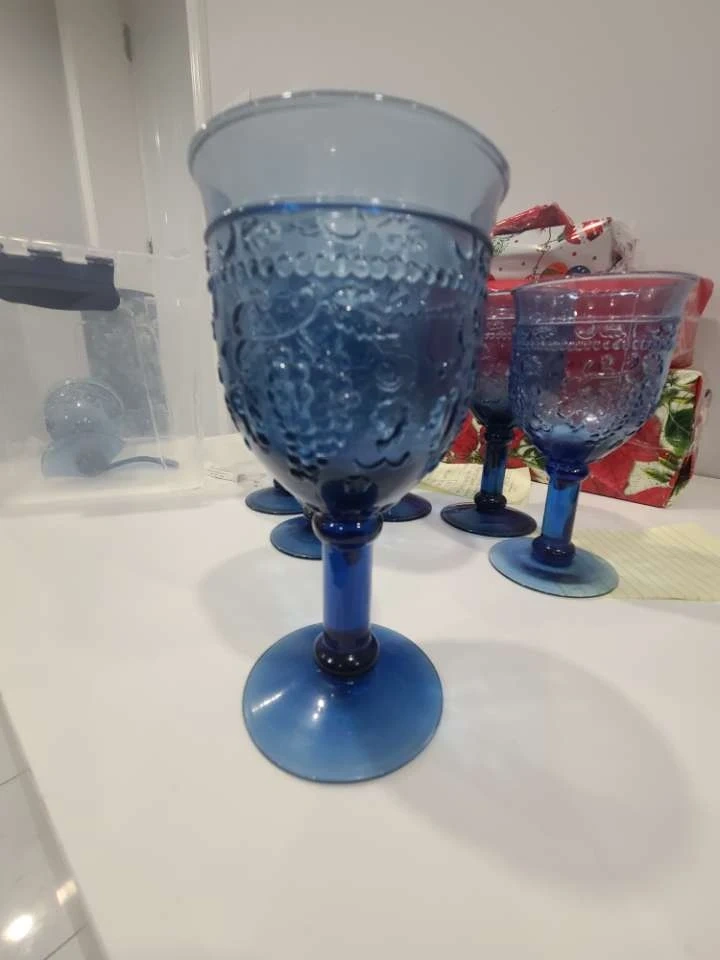 This is a set of seven blue glass goblets with an embossed grape vine pattern. They're perfect for serving wine or other beverages. Add a touch of vintage charm to your table setting!