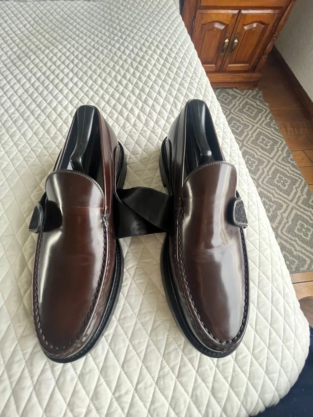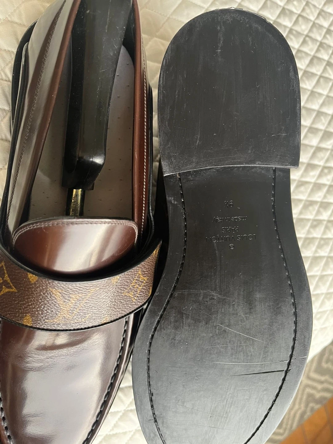 These are Louis Vuitton loafers in brown. They feature the signature monogram canvas strap across the vamp. Made in Italy. Leather soles.
