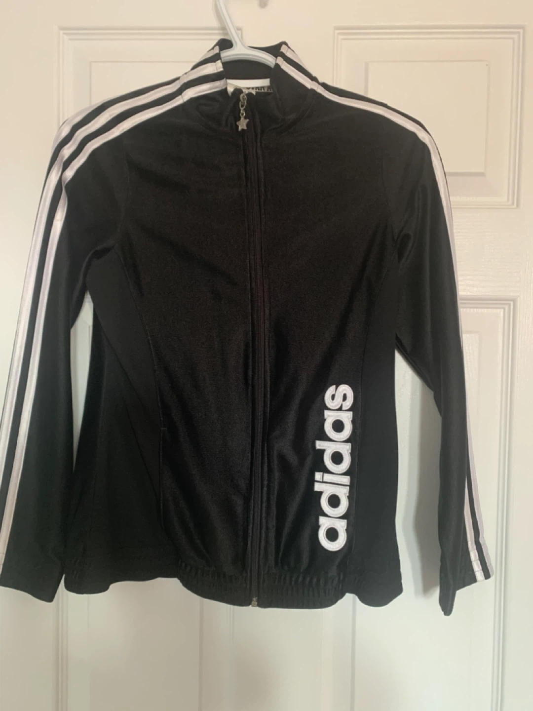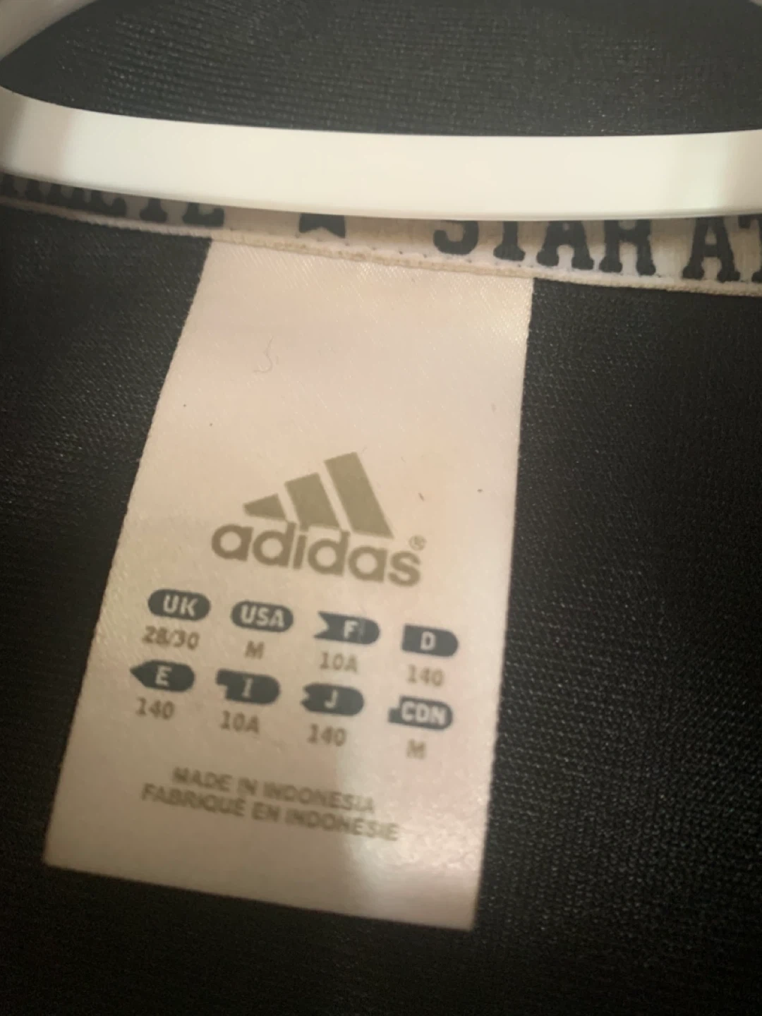This is an Adidas black track jacket for kids. It's a size M with the classic white Adidas stripes on the sleeves. The jacket is made in Indonesia.