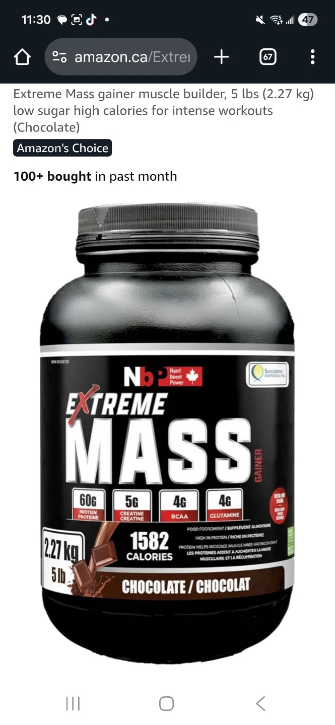 Nb Extreme Mass Gainer in Chocolate flavour. It's 5 lbs (2.27 kg) with 1582 calories per serving. Contains 60g protein, 5g creatine, 4g BCAA, and 4g glutamine. Ideal for intense workouts!