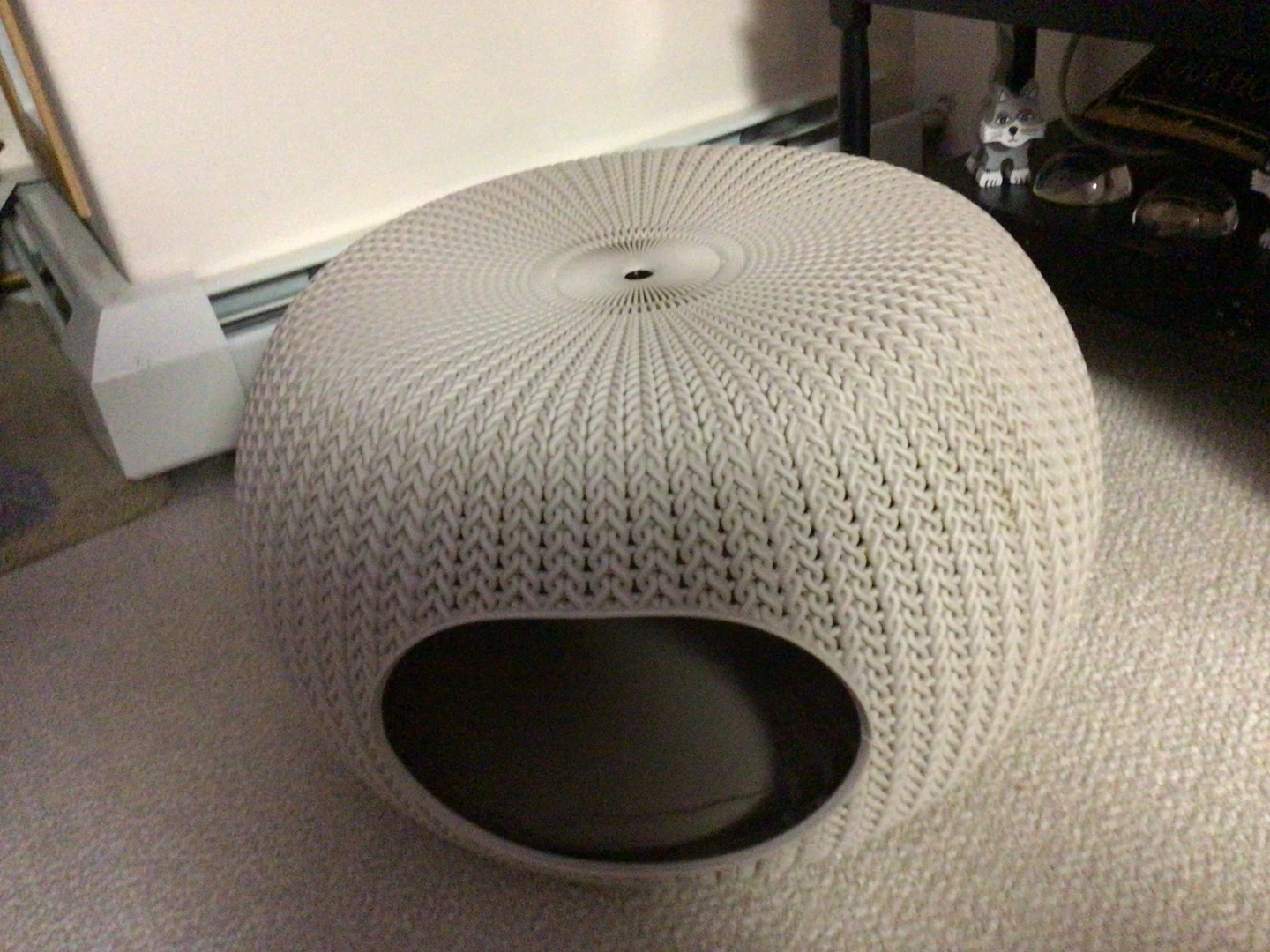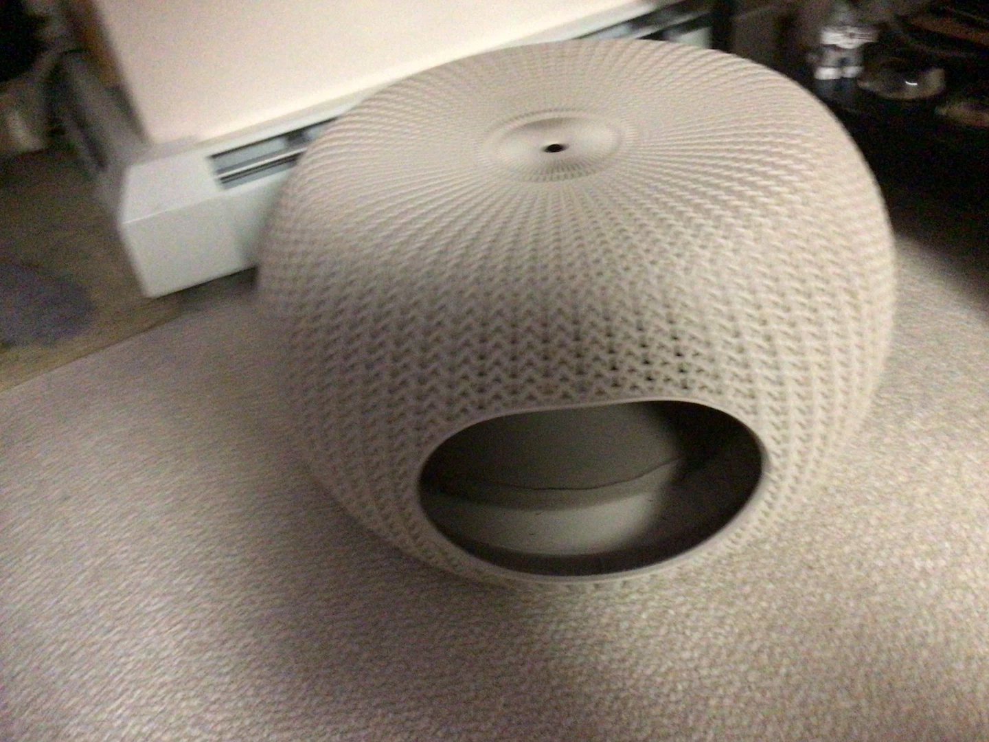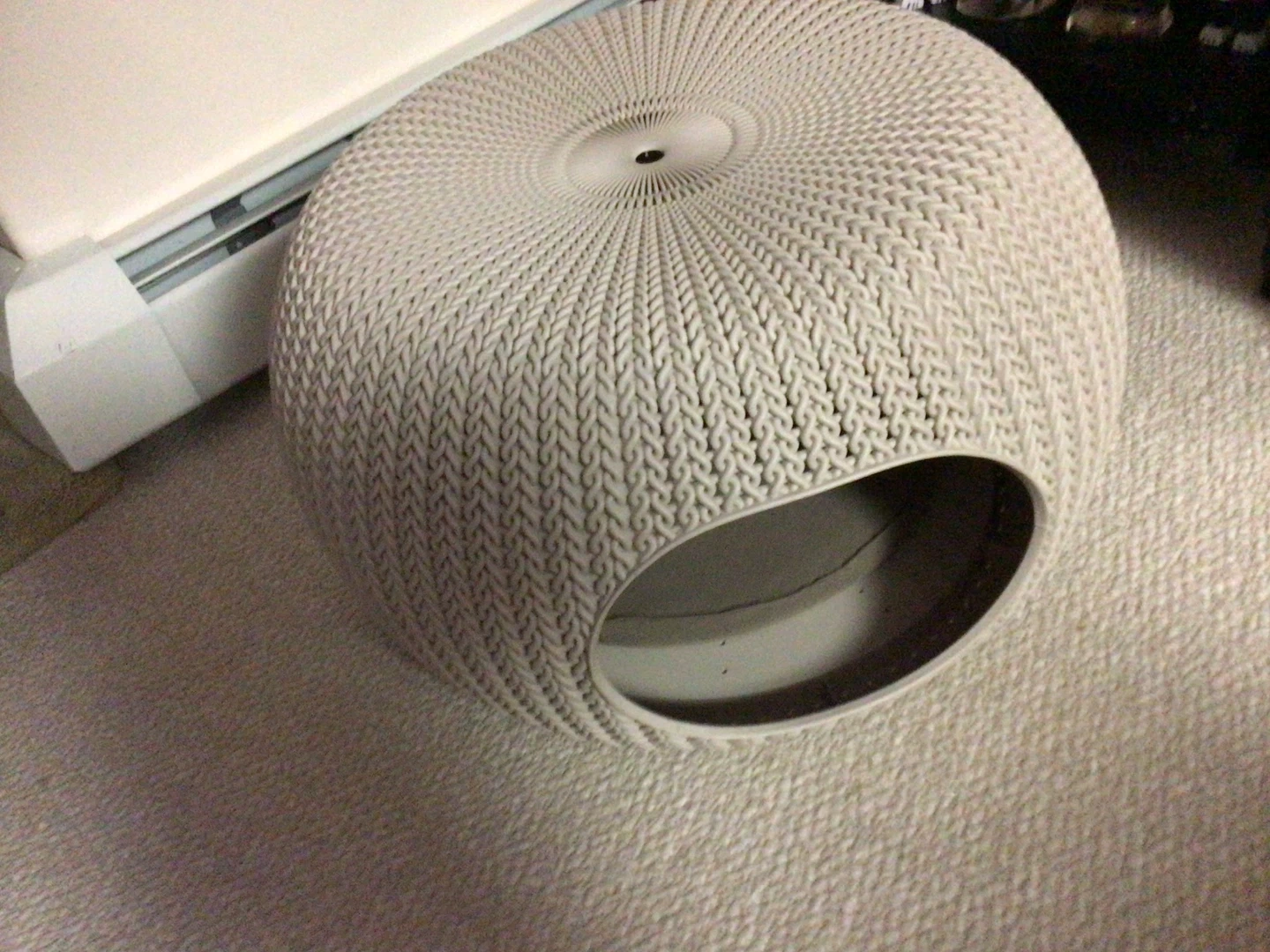 A stylish, textured pet bed or house in a neutral cream colour. It's designed with a unique woven-look pattern. This piece offers a cozy spot for cats or small dogs.