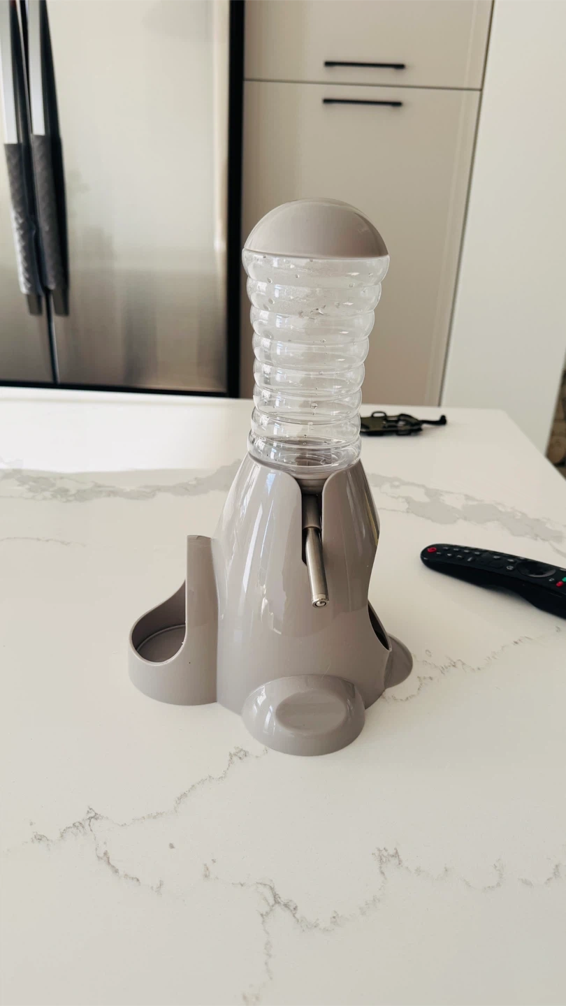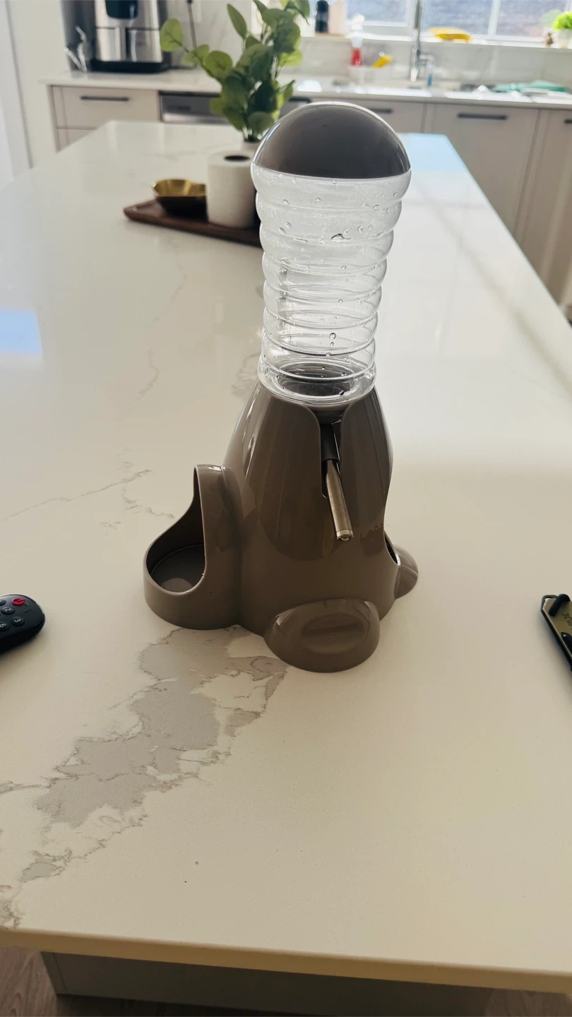 It’s brand new This pet water dispenser features a clear ribbed bottle for easy water level monitoring. It has a grey base with two openings, likely for food or treats.. we just try to put water but didn’t use it bought it from pet store .lost the box that’s why selling here