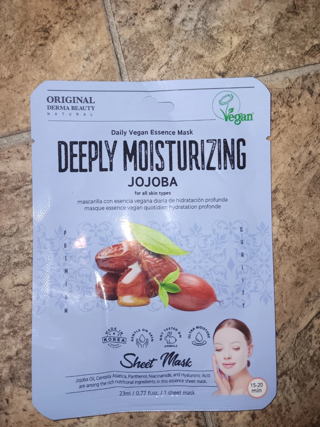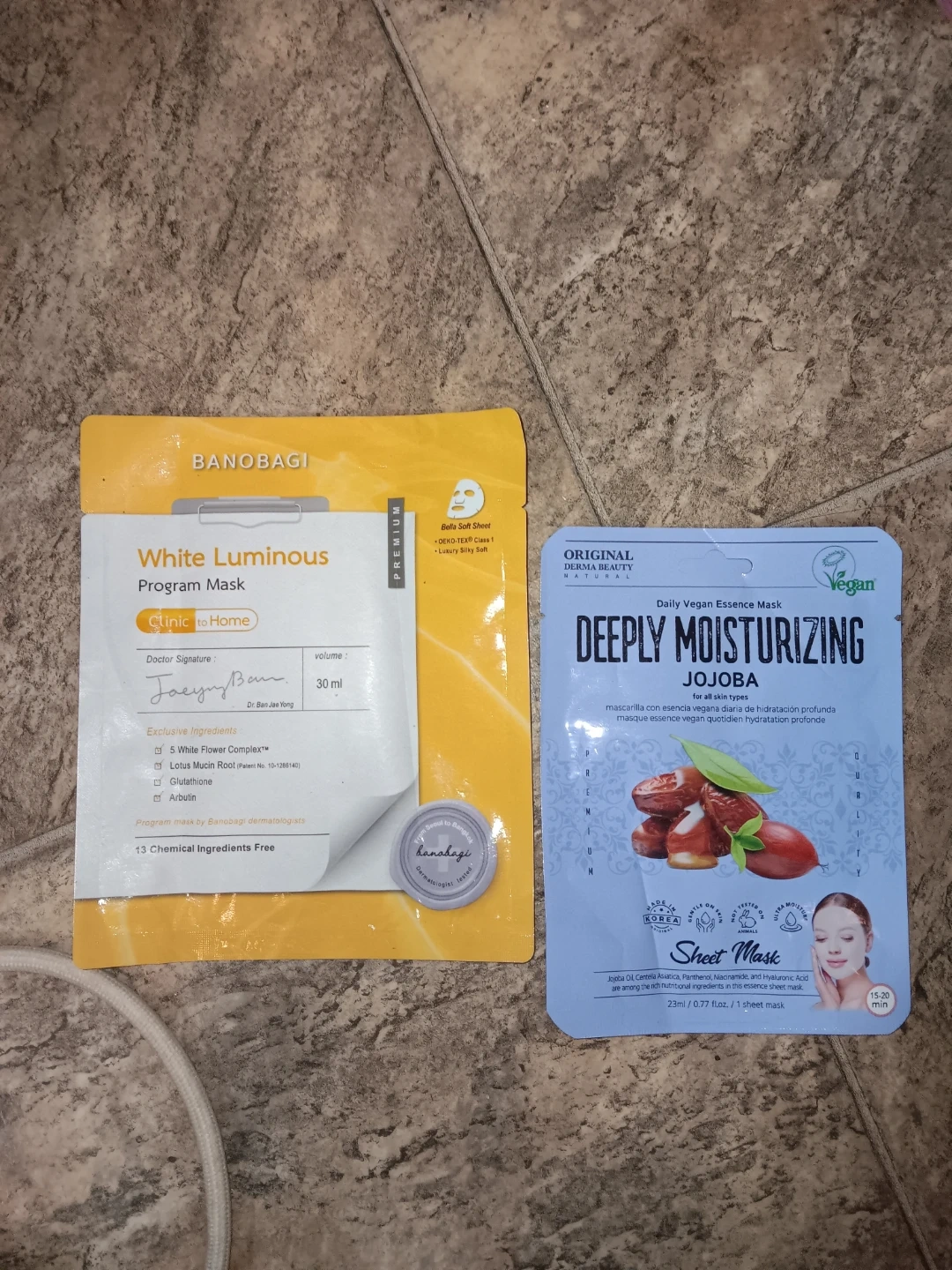 Two single-use facial sheet masks. The Banobagi mask is 30 ml and features a White Flower Complex, Glutathione, and Arbutin. The Derma Beauty mask is 23 ml with Jojoba Oil, Panthenol, Niacinamide, and Hyaluronic Acid. Both are designed for skin hydration and radiance.