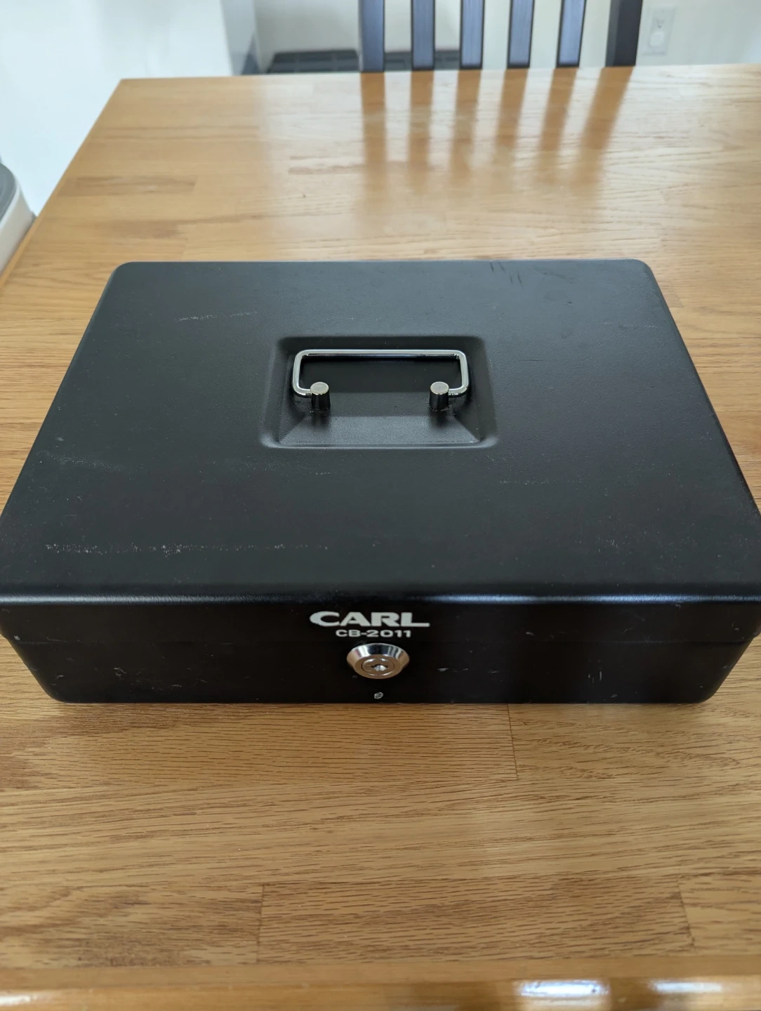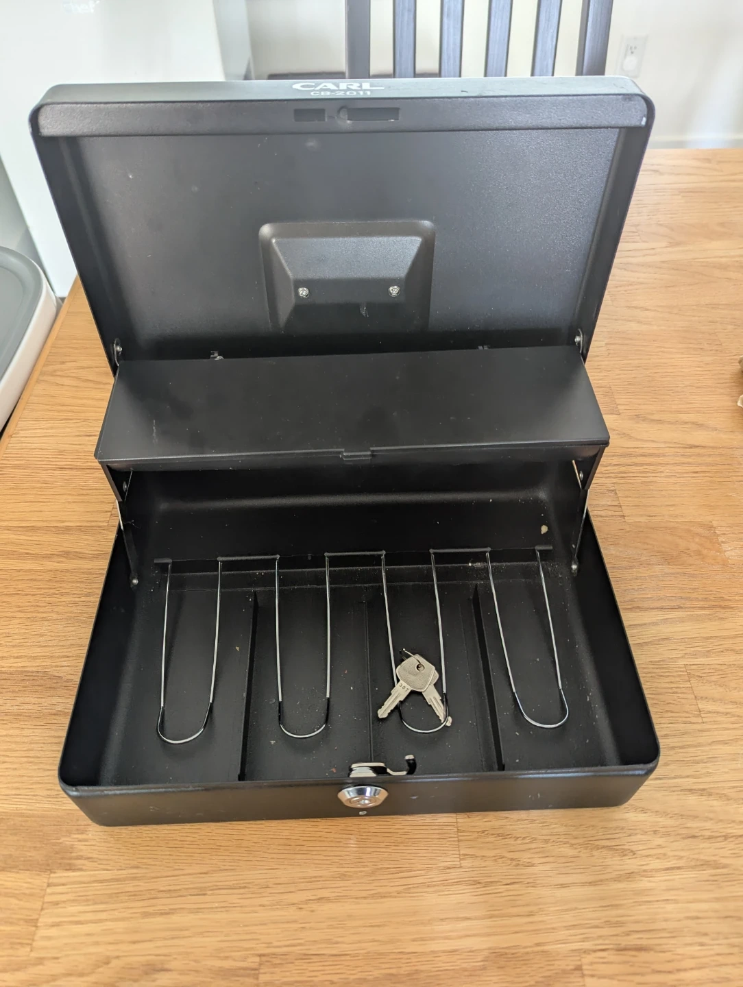 This is a CARL CB-2011 cash box. It's black metal and includes the original keys. The interior has a tray for bills and coin slots. Coin slot lid hinge needs to be reattached