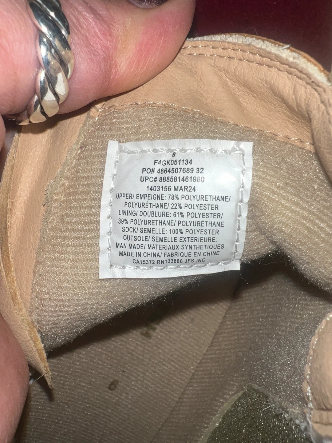 These Joe Fresh Chelsea boots feature a tan suede upper with elastic side panels for easy on and off. The lug sole provides good traction. They're made with a synthetic lining and outsole. Size is 6.