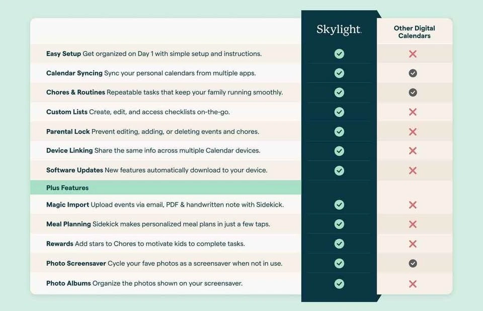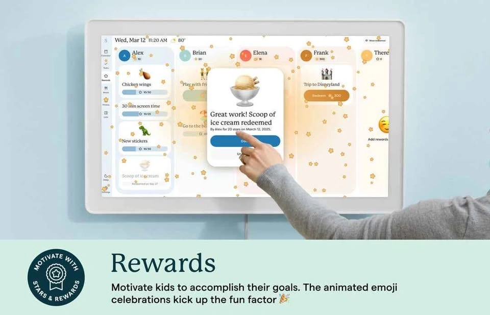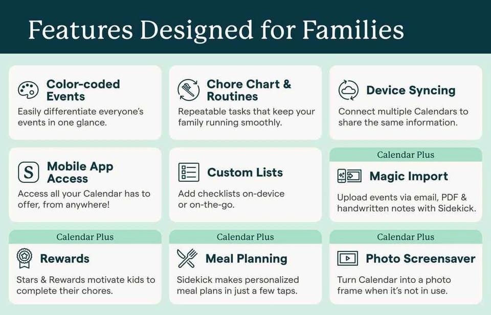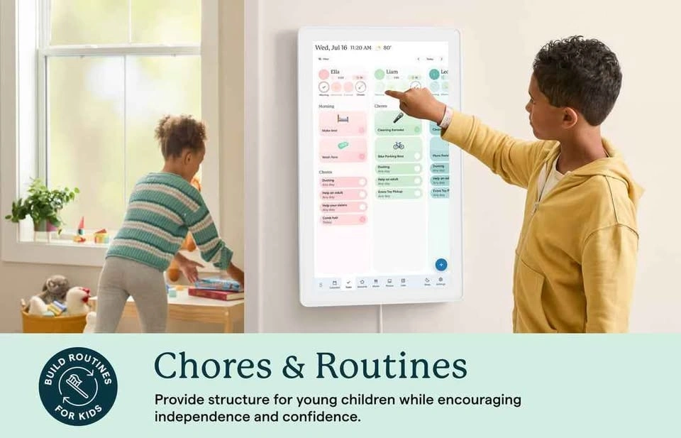 Features: Huge 27″ Quad-HD touchscreen display, syncs calendars from multiple devices, interactive chore chart, lists, reminders, and schedules, can be mounted in portrait or landscape, built-in family planner features (meal planning, task lists, weather, etc.), wall mount bracket + power adapter included.