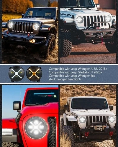 Upgrade your Jeep Wrangler JL/JLU (2018-2023) or Gladiator JT (2020-2023) with these 9-inch headlights featuring an X-style white DRL and amber turn signal. They offer bright LED performance with 60W high beam (4200lm) and 40W low beam (2800lm), much brighter than stock halogen lights. The design ensures a sharp cut-off line to avoid blinding other drivers while providing excellent visibility. These are a direct plug-and-play replacement for stock halogen headlights, requiring no extra brackets. Adjustable screws allow for easy beam angle changes. Includes a pair of headlights, DRL extension cords, turn light extension cords, and fitting screws. Please note: connecting the DRL and turn signal wires may require modifying your vehicle's existing wiring. Let me know if you're interested!