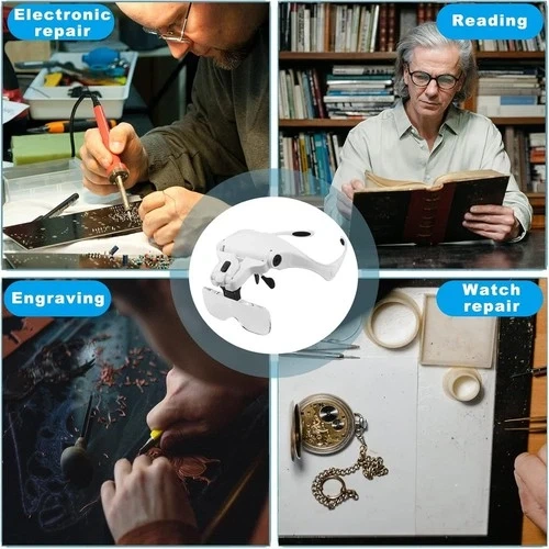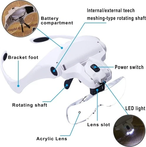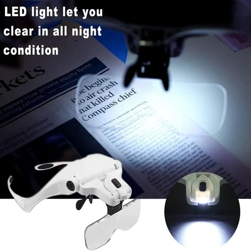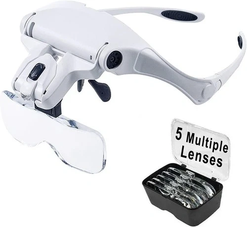 Wimayo brand white headband magnifier with LED light. Includes 5 detachable acrylic lenses with magnifications of 1.0X, 1.5X, 2.0X, 2.5X, and 3.5X. The LED light is adjustable and powered by 3 AAA batteries (not included). Comfortable and lightweight ergonomic frame. Great for close work like jewelry, watch repair, electronics, reading, and crafts. Suitable for seniors, hobbyists, and professionals. Comes with a storage case, cleaning cloth, and replaceable head strap.