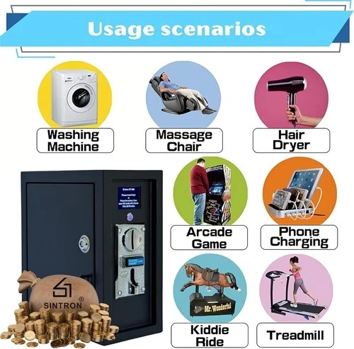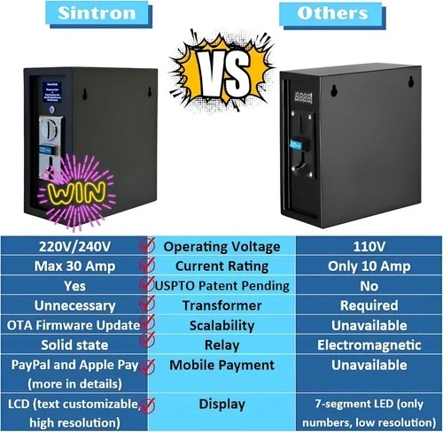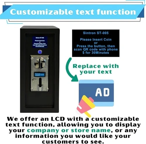 This Sintron ST-005 Timer Control Power Box is designed for US/Canada electronic devices and supports up to 30A. It features an LCD display and mobile payment options. You can customize the on-screen text with your store name or contact number. The device supports Over-The-Air (OTA) firmware updates. It's suitable for various applications like gaming machines, massage chairs, washing machines, shoe polishers, chargers, and PCs. This product has a patent pending, and all cables meet safety regulations. Let me know if you're interested!