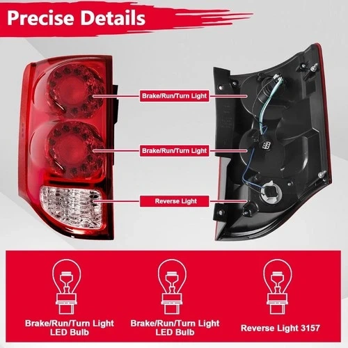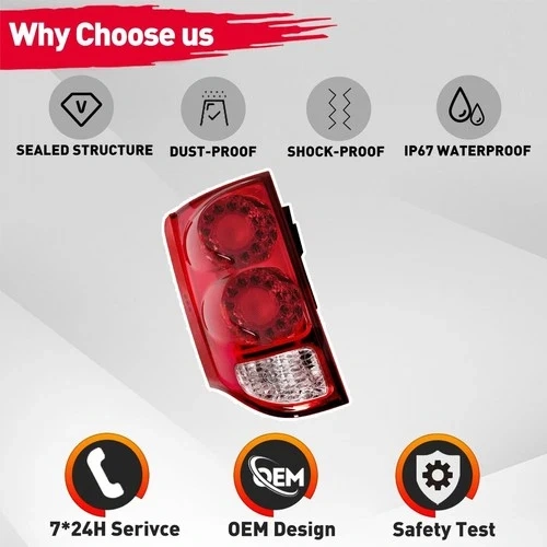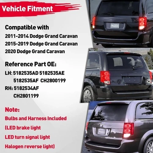 This is a left driver side LED tail light assembly for a 2011-2020 Dodge Grand Caravan. It's designed as a direct replacement and is waterproof. The LED light source provides bright illumination for safer driving. Replaces part numbers 5182535AD, 5182535AE, 5182535AF, and CH2800199. Bulbs and harness are included (LED brake/turn signal, Halogen reverse).