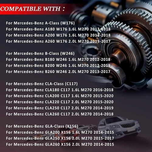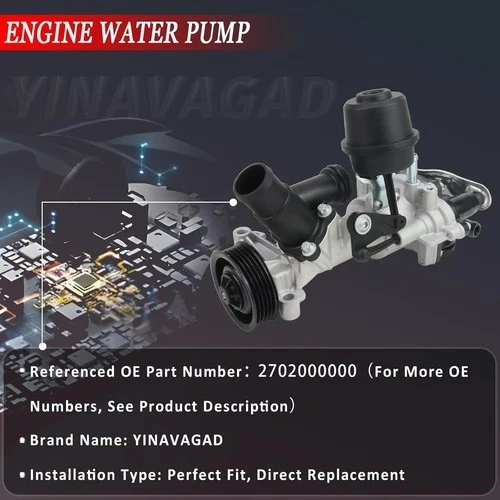 High quality aluminum engine water pump for Mercedes Benz A-Class (W176) 2013-2018 (A180, A200, A260), B-Class (W246) 2012-2019 (B180, B200, B260), CLA Coupe (C117) 2014-2018 (CLA180, CLA200, CLA260), and GLA-Class (X156) 2014-2018 (GLA200, GLA260). This is a new replacement part. Please check your vehicle's part numbers to ensure compatibility. OEM numbers include: 2702000000, A2702000800, and others listed. Feel free to message if you have any questions!