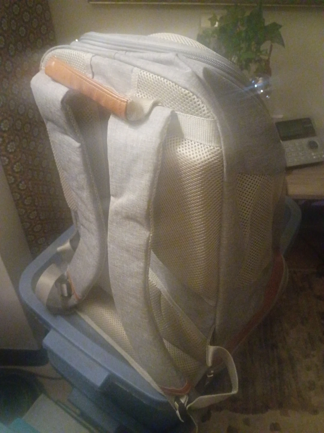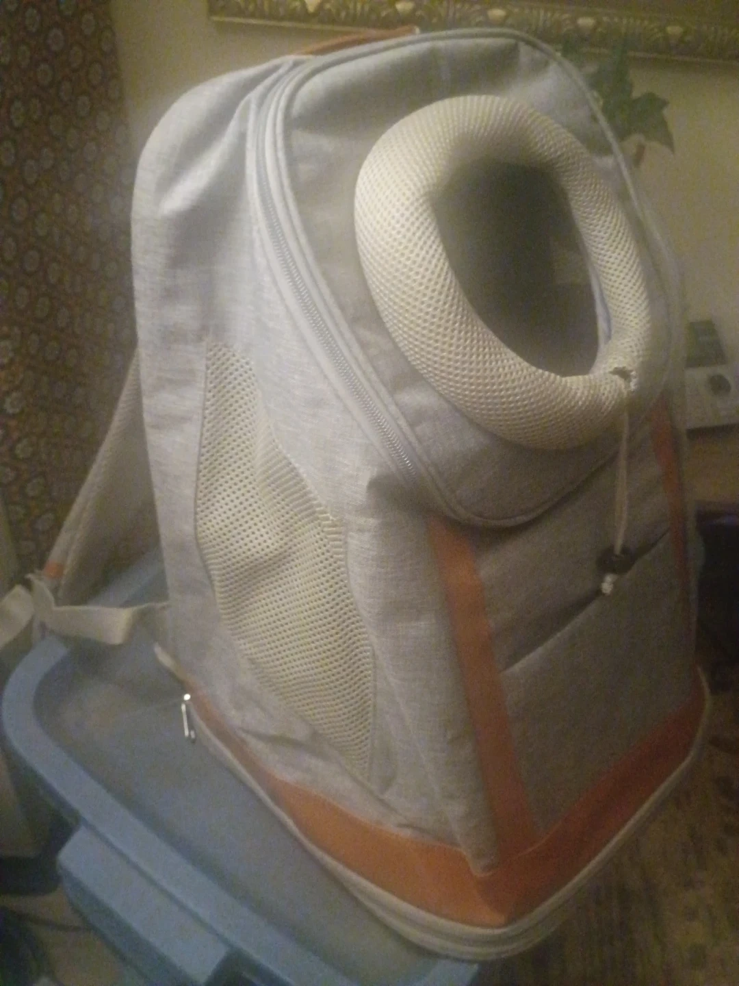 This is a grey pet carrier backpack with mesh ventilation and a padded opening for your pet's head. It has adjustable straps and is made of durable fabric. It's great for carrying small pets on the go!