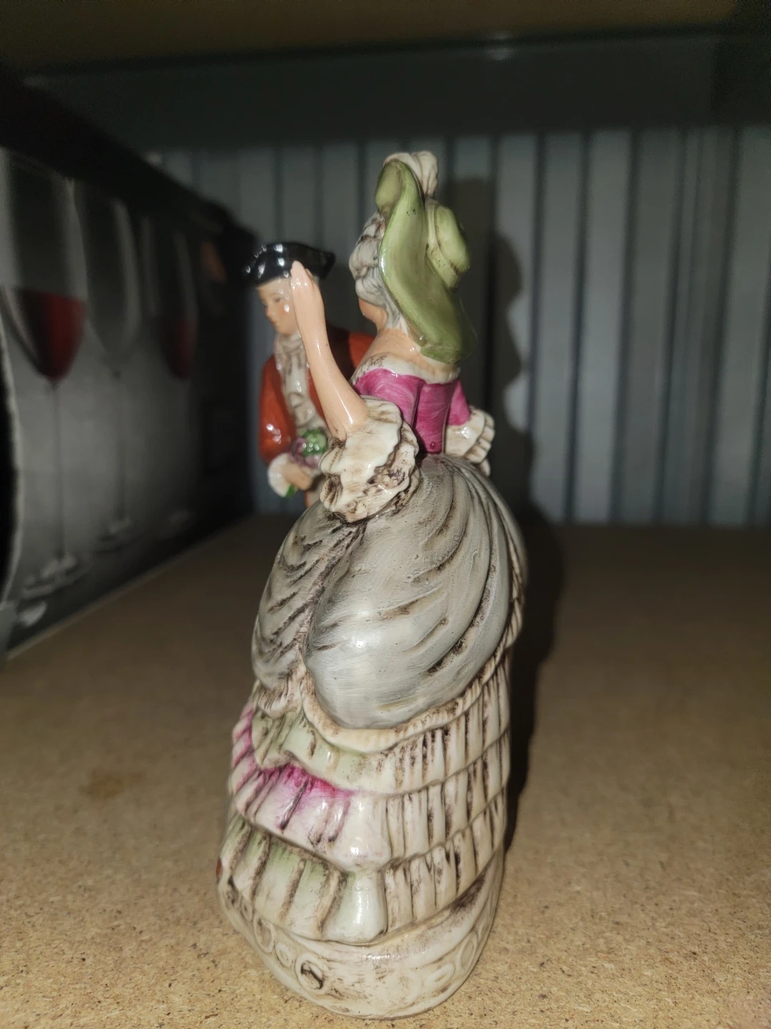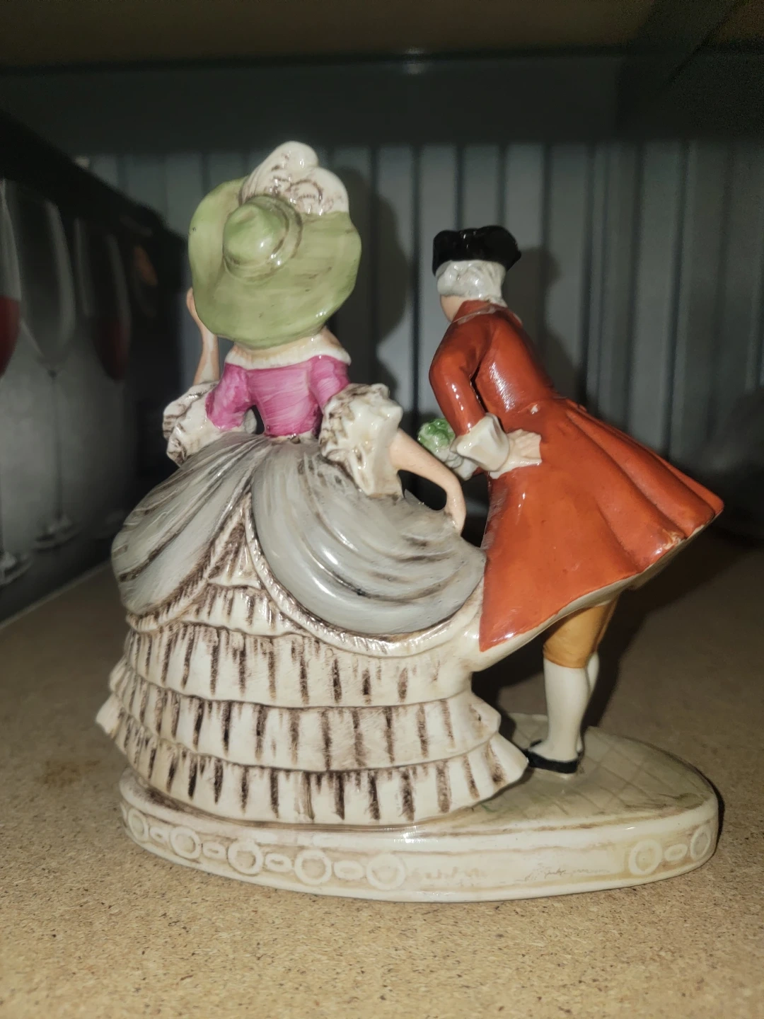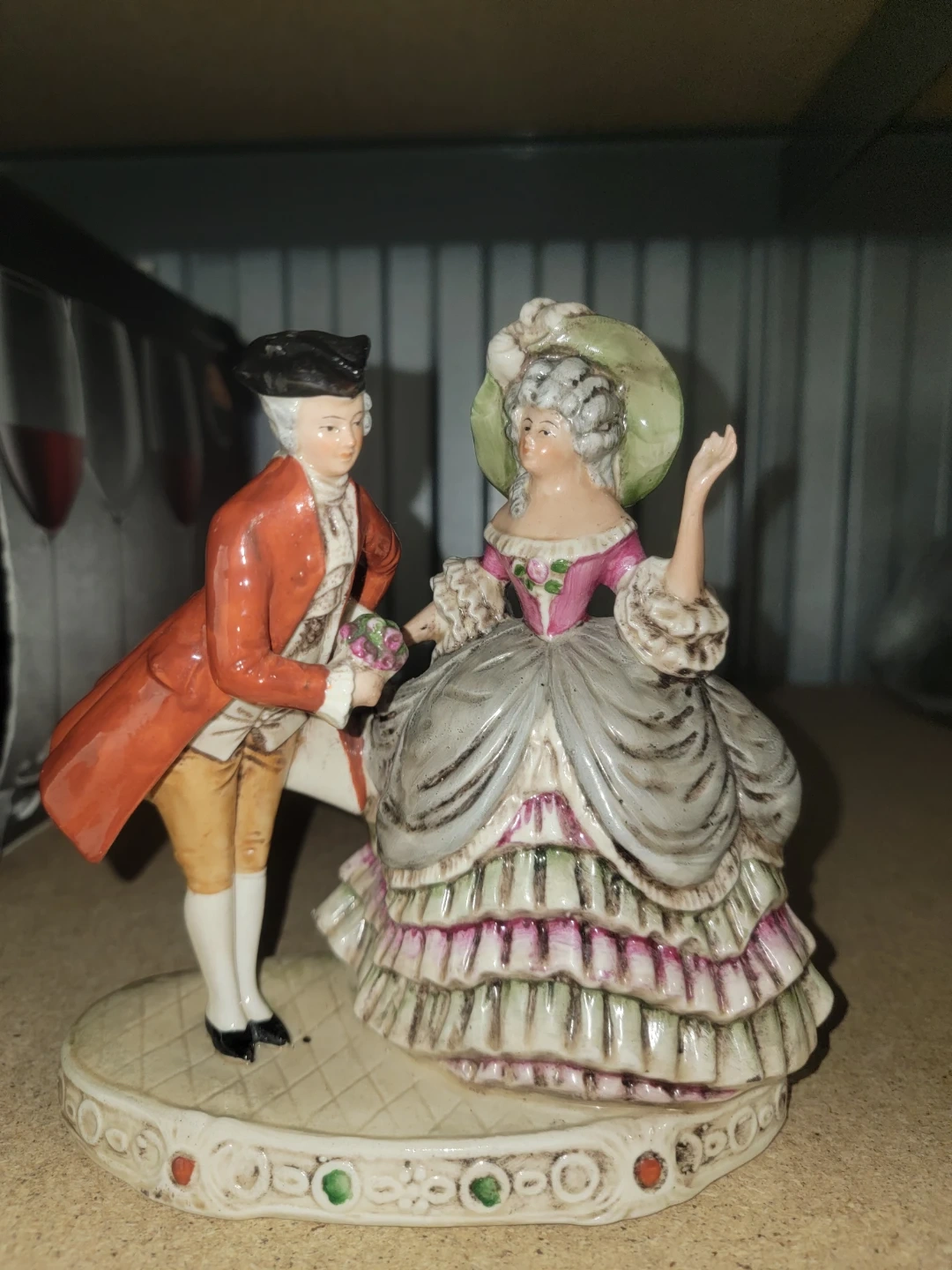 This is a decorative porcelain figurine featuring a couple . The detail on the clothing and base is quite intricate. It's a lovely piece for display.