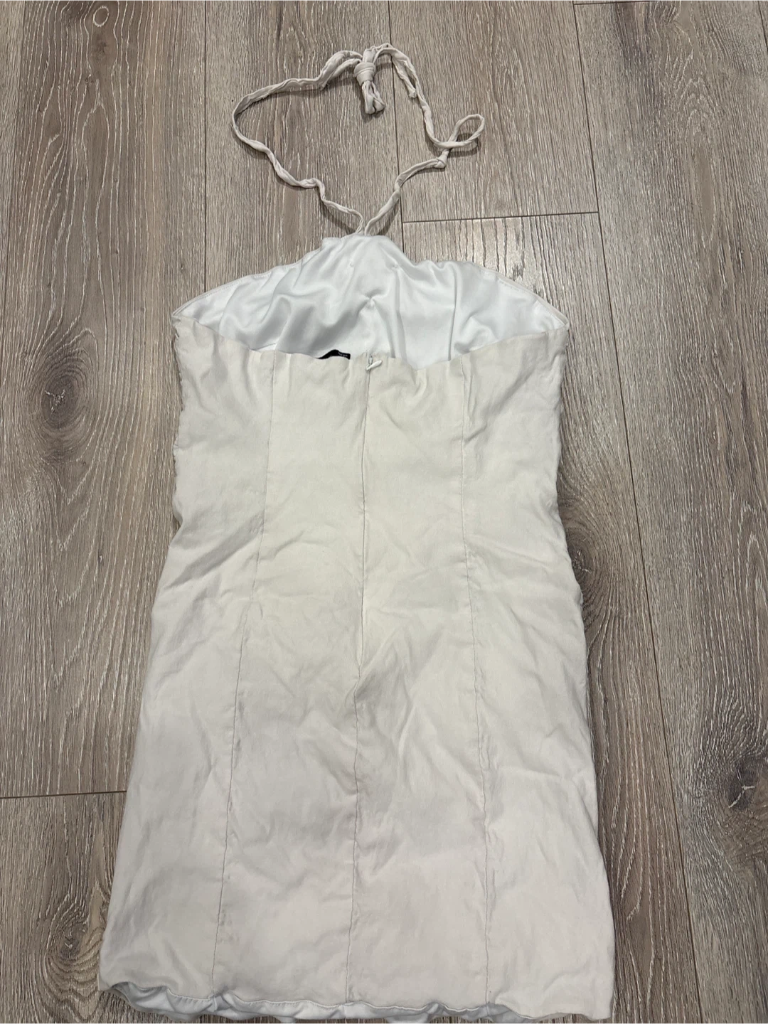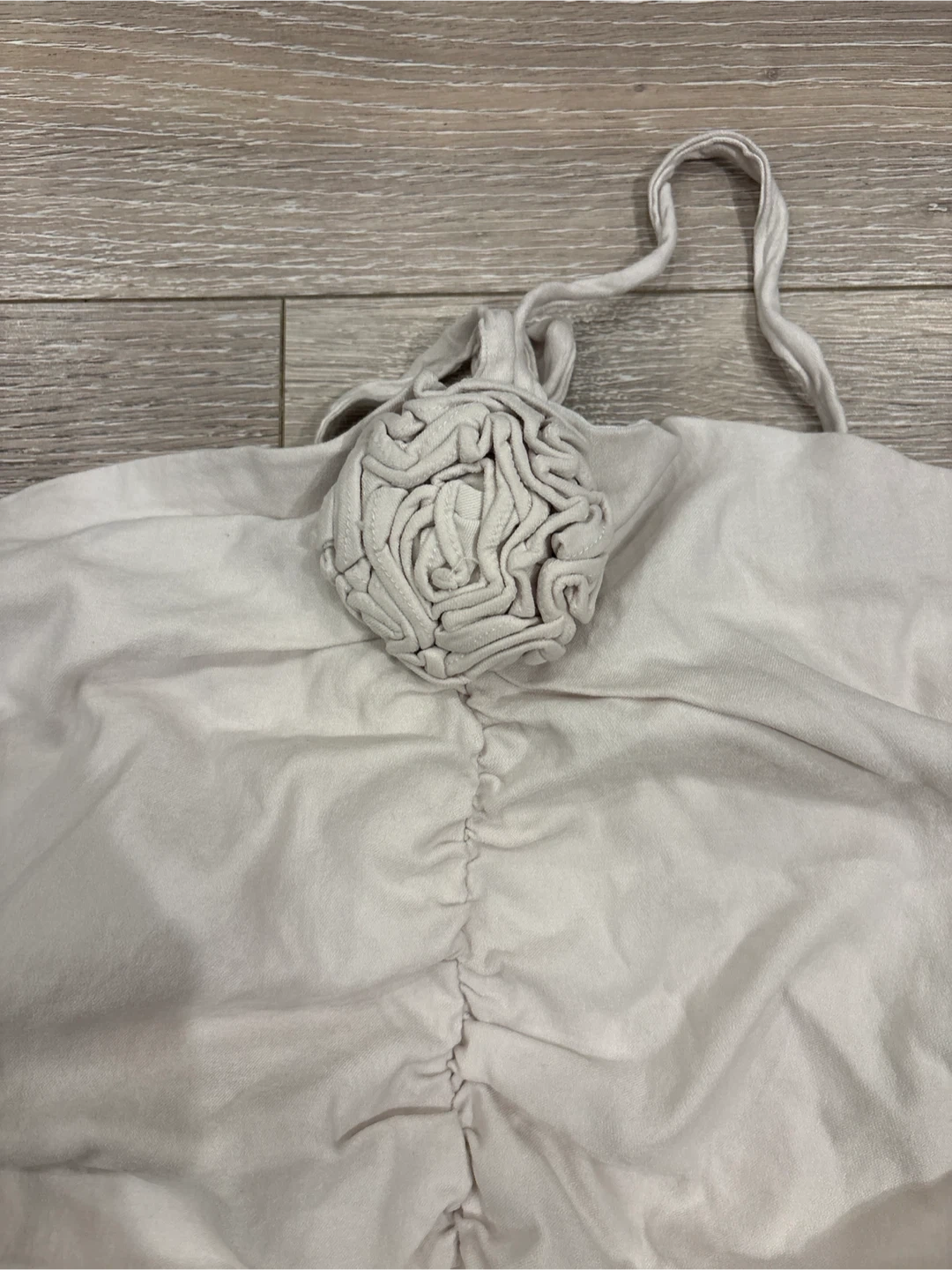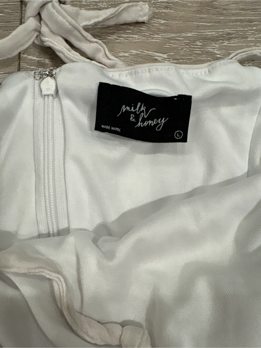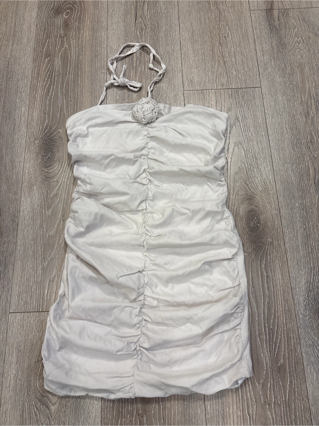 This white halter dress features a ruched bodice with a decorative rose detail at the bust. It has a tie-back closure for a customized fit. Made with a smooth lining, it's ready for your next outing! Brand milk and honey size L pick up walnut grove Langley