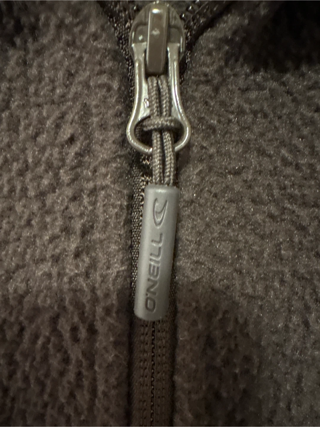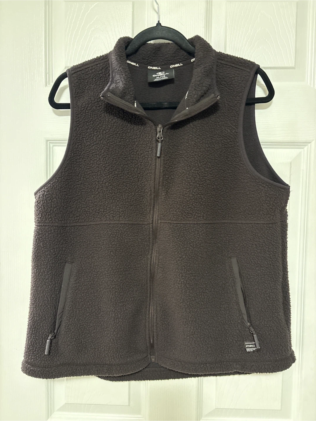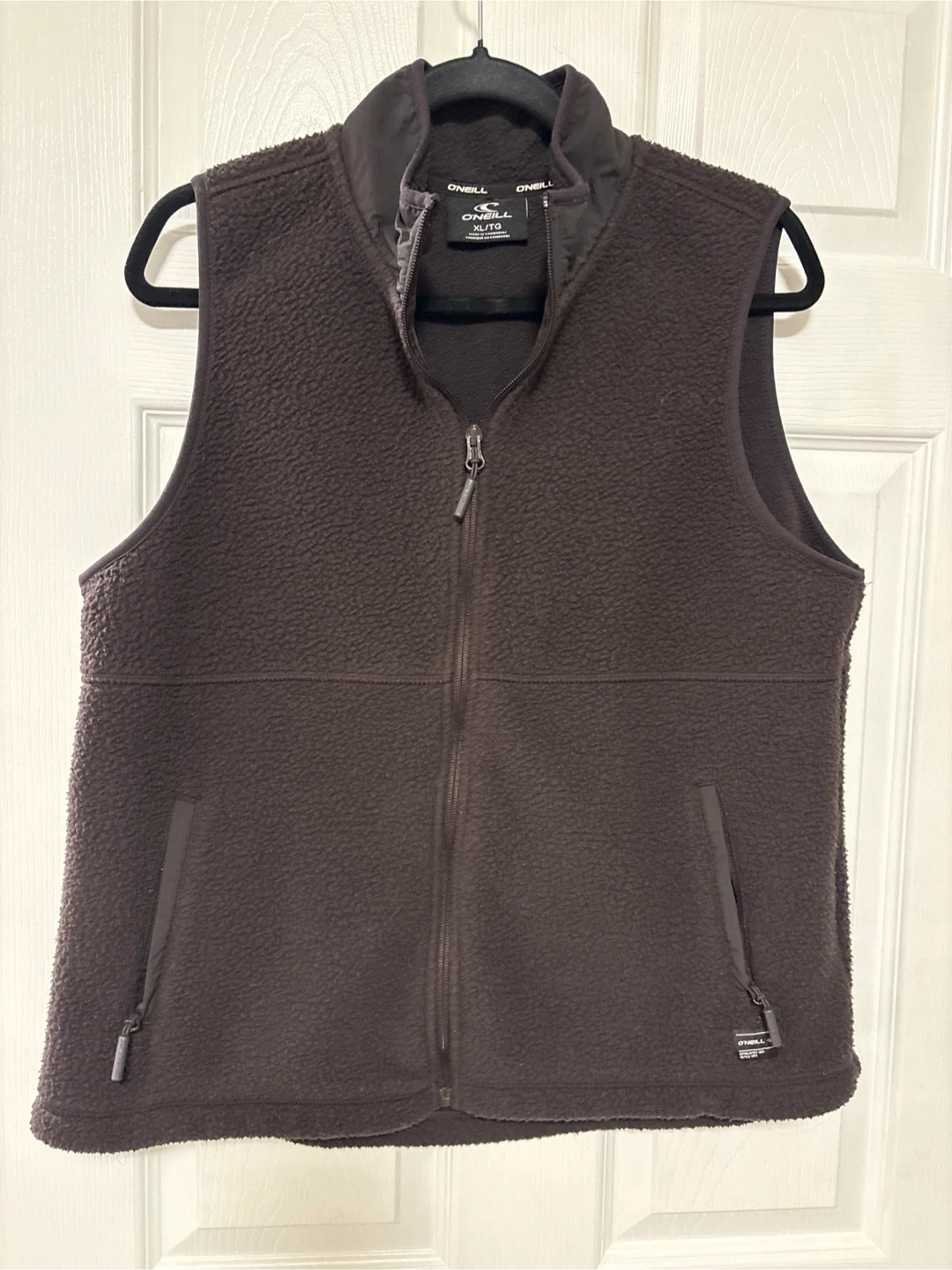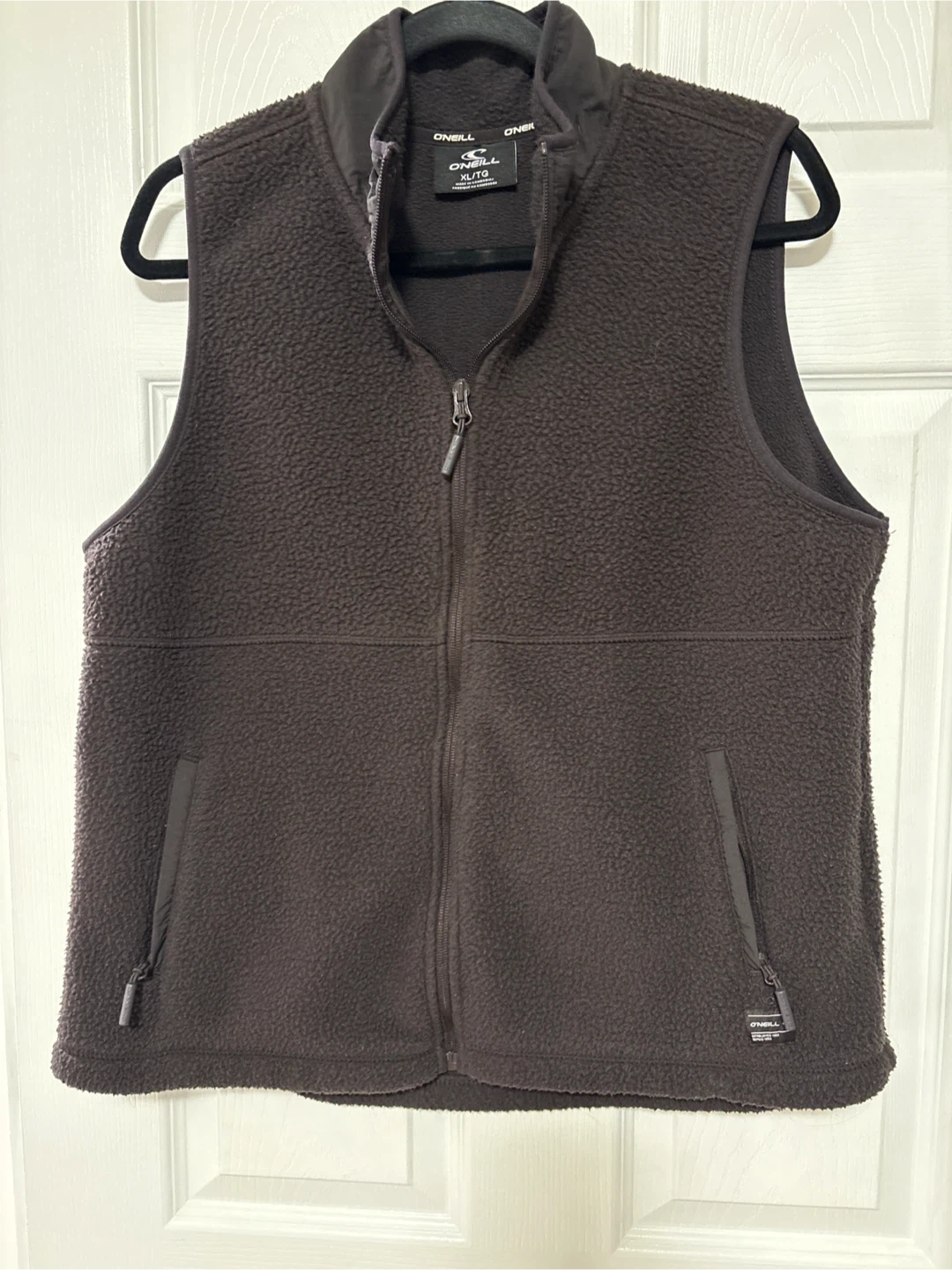 O'Neill zip-up fleece vest in dark brown. It's a size XL/TG. Features two zippered hand pockets and a mock neck. Made from soft fleece material.