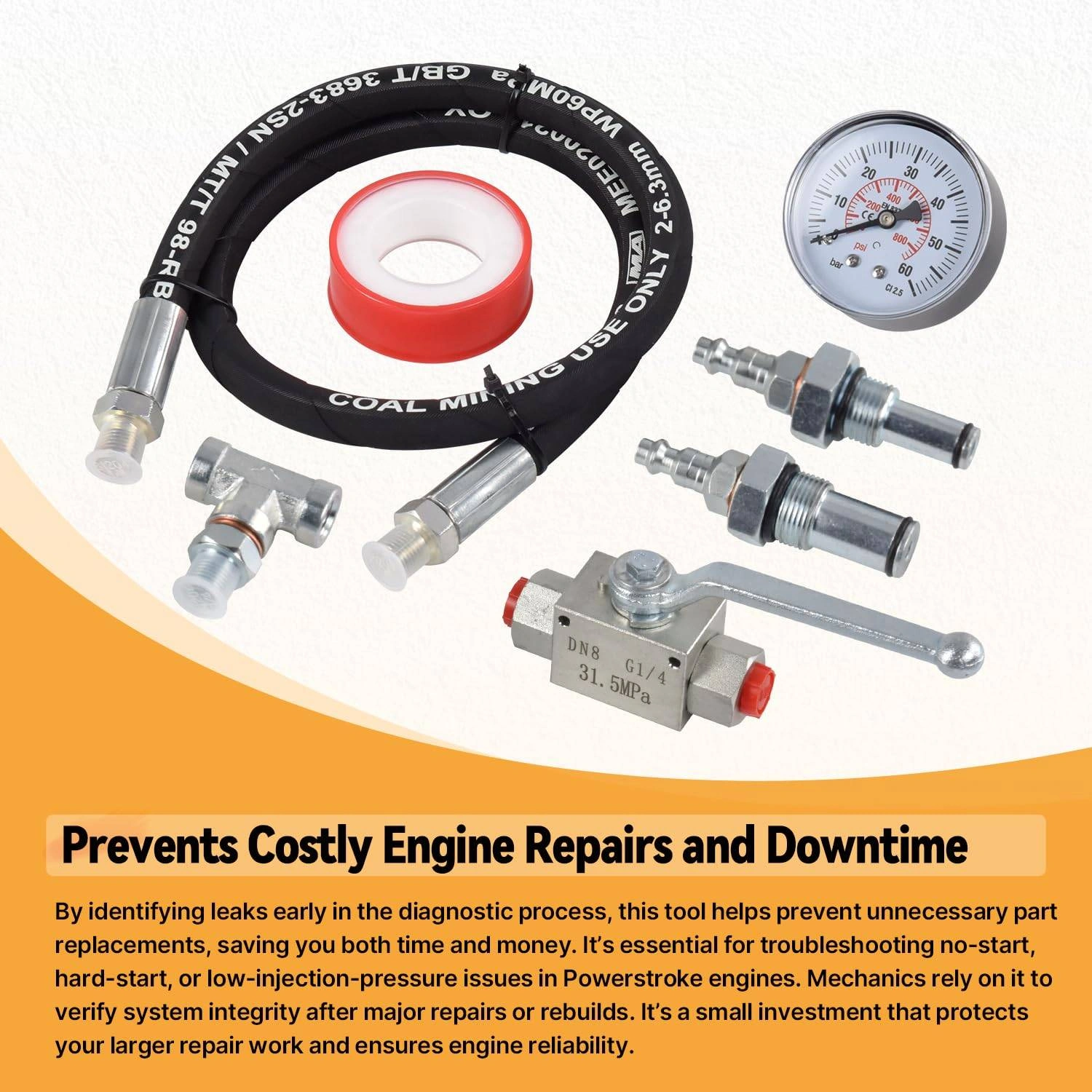 Comprehensive Diagnostic Function: Engineered to help you identify internal and external high-pressure oil system leaks without having to fully start the engine. By pressurizing the system with regulated shop air, you can quickly determine if leaks exist in the IPR valve, stand pipes, dummy plugs, or injector seals. It provides a safe and effective way to troubleshoot no-start or hard-start issues.